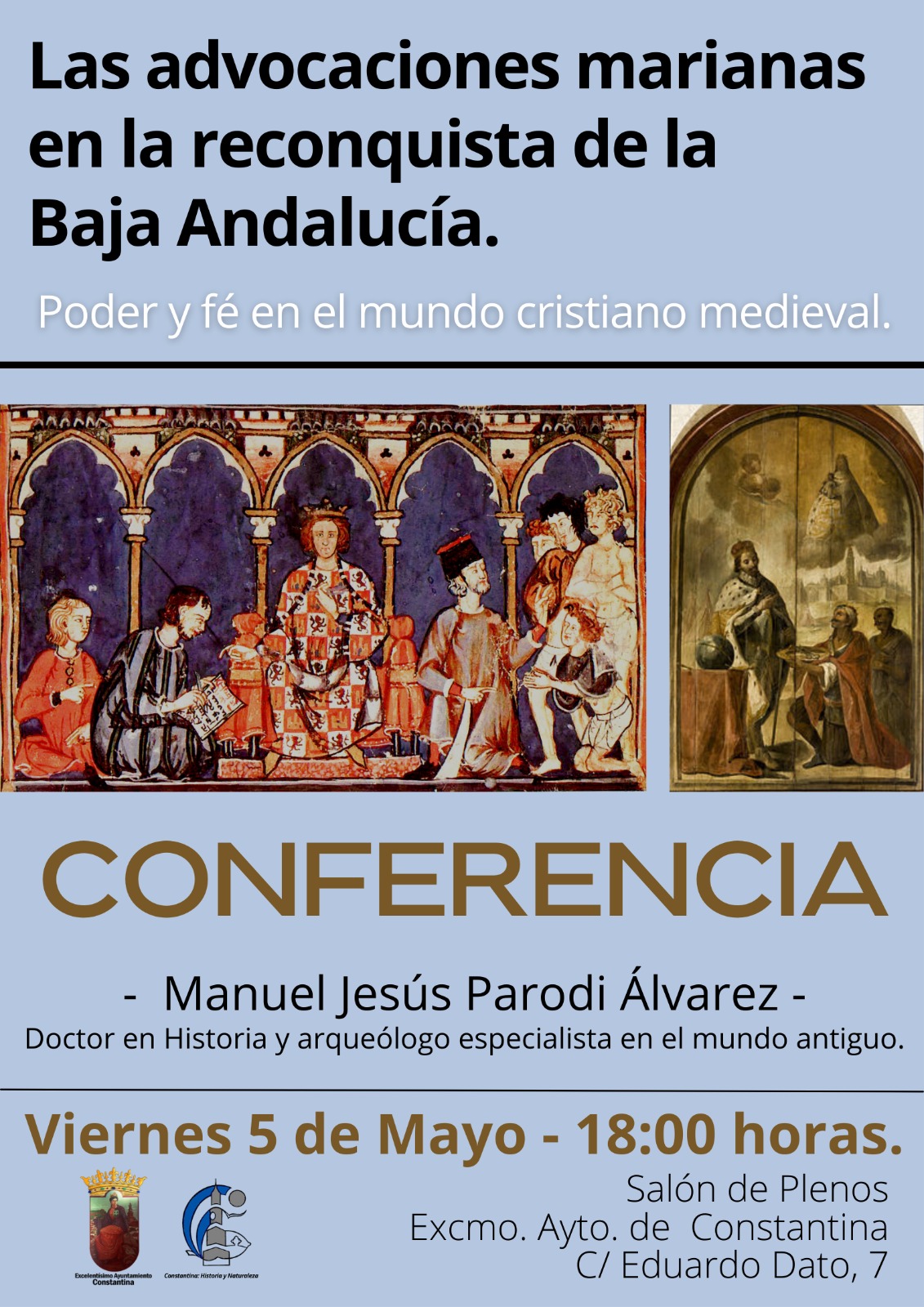 La delegación de Cultura del Ayuntamiento de Constantina, en colaboración con Diputación de Sevilla, nos trae el viernes 5 de mayo, a las 18:00 horas, en el Salón de Plenos del Ayuntamiento, una interesante Conferencia sobre "Las advocaciones marianas en la reconquista de la Baja Andalucía. Poder y fe en el mundo cristiano medieval" a cargo del historiador, arqueólogo e investigador, Manuel J. Parodi.