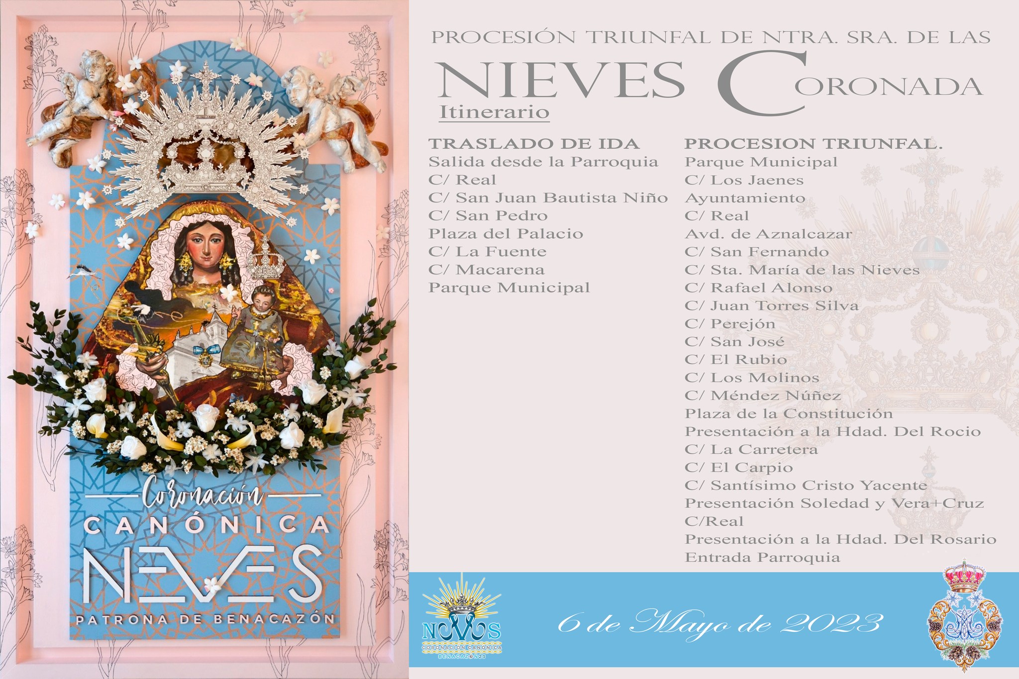 El Ayuntamiento de Benacazón informa sobre el RECORRIDO de nuestra Patrona en el gran día de su CORONACIÓN CANÓNICA. Para la ocasión, la Comisión de Ntra. Sra. de las Nieves ha elegido un "recorrido inédito para la procesión de nuestra Bendita Madre, para que la Santísima Virgen pueda llegar a las máximas calles posibles de nuestro pueblo".