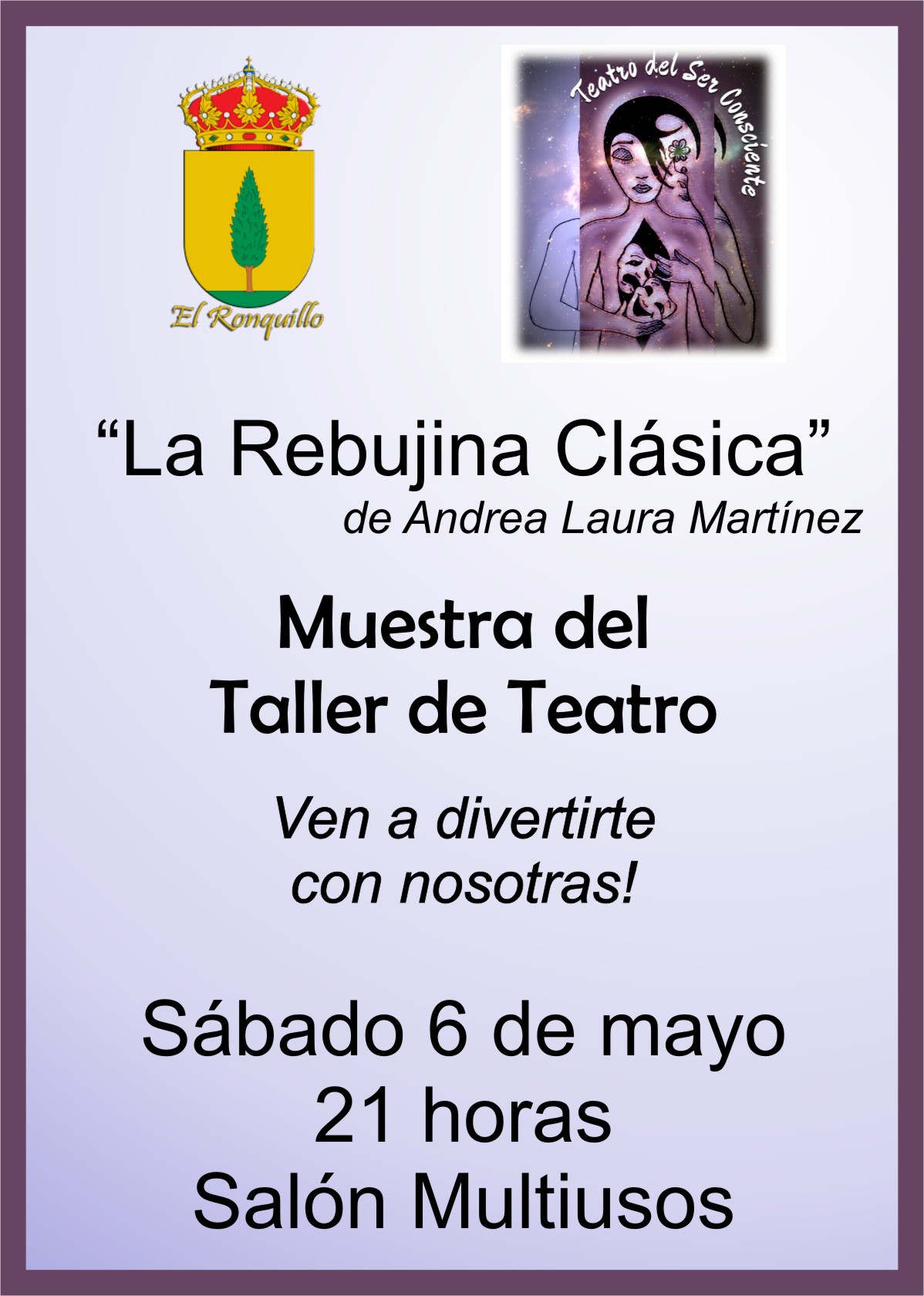 Muestra de teatro de las alumnas del Taller de Teatro impartido en los últimos meses en El Ronquillo. Interpretarán "La rebujina clásica", de Andrea Laura Martínez, en el Salón Multifuncional. Entrada gratuita.