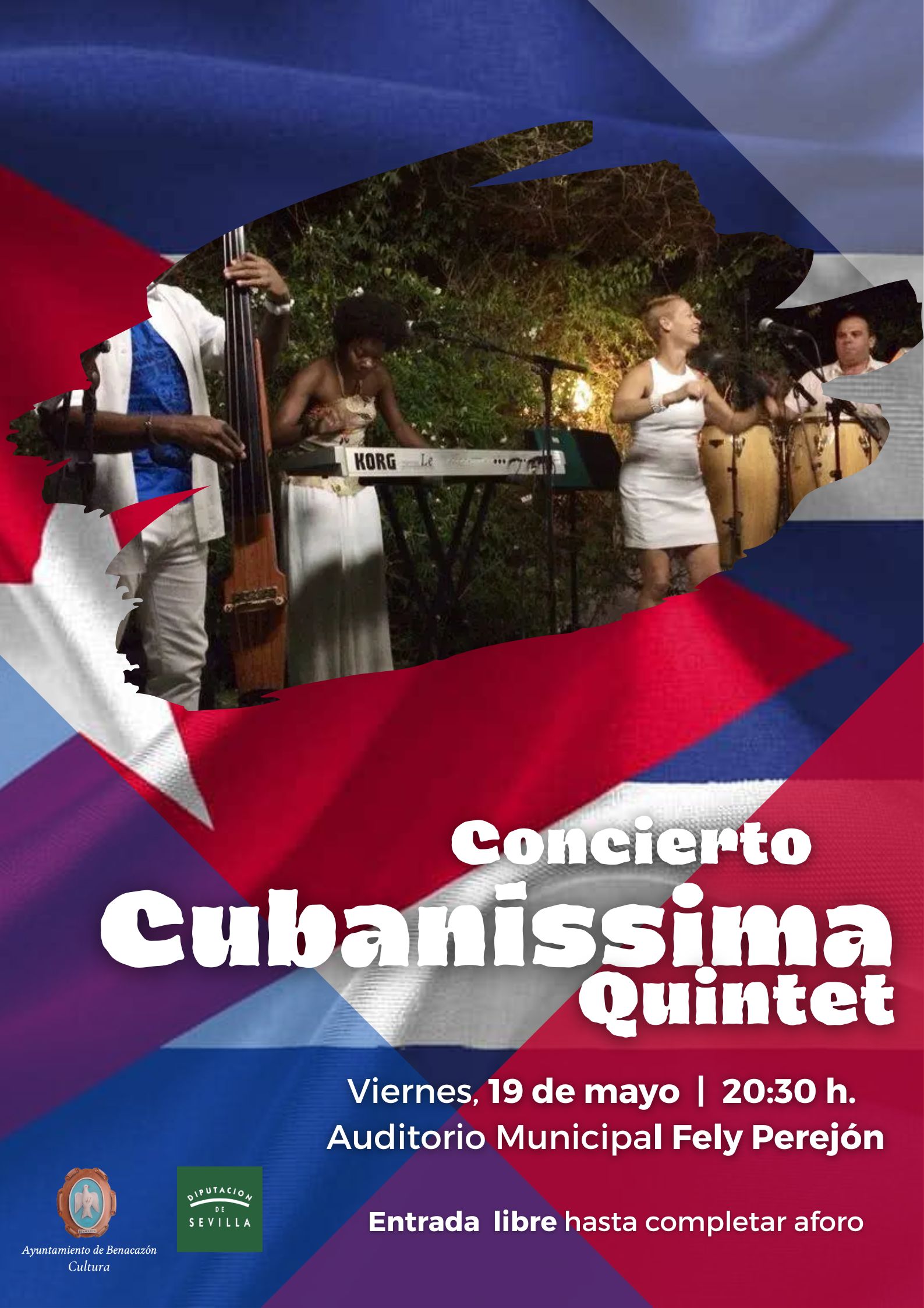 El Ayuntamiento de Benacazón informa sobre el CONCIERTO "CUBANÍSSIMA QUINTET" del que podremos disfrutar el Viernes 19 de Mayo a las 20:30 h. en el Auditorio Municipal Fely Perejón, con ENTRADA LIBRE hasta completar aforo.