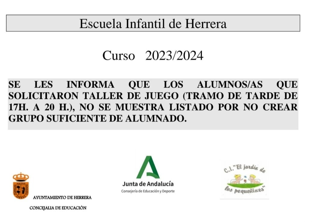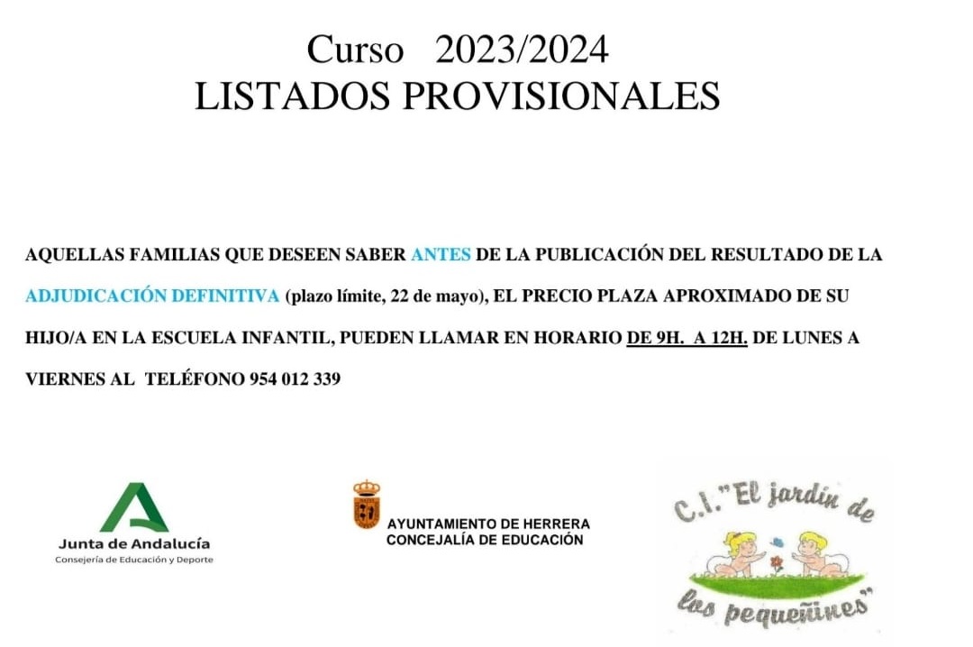 Los listados presentados tienen carácter provisional dado que las plazas pueden venir modificadas cuando la Delegación de Educación disponga de los listados definitivos (a partir del 24 de mayo). Se abre el plazo de alegaciones a las familias desde el 9 de mayo al 23 del mismo mes. Aquellas familias que deseen saber, antes de la publicación del resultado de la adjudicación definitiva (límite 22 de mayo), el precio aproximado de la plaza de su hijo/a en la Escuela Infantil pueden llamar en horario de 09:00 horas a 12:00 horas de lunes a viernes al teléfono 954 012 339. Además, se informa de que el "Taller de juego" (en horario de tarde) no se llevará a cabo por no haber llegado al mínimo de alumnos para su desarrollo.