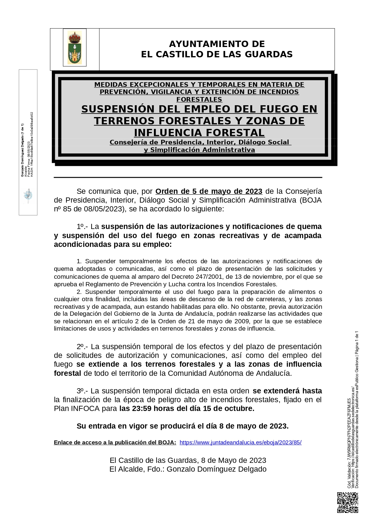 SUSPENSIÓN DEL EMPLEO DEL FUEGO EN