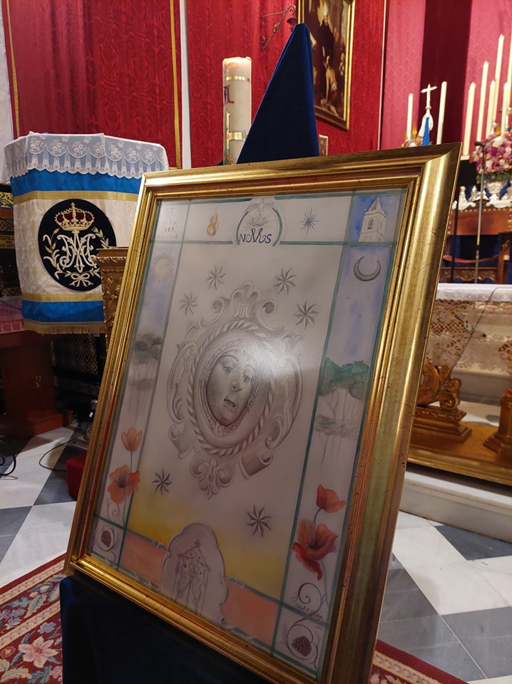 Obra pictórica de Daniel Acuña Ortega, el cartel destaca como "epicentro la Santísima Virgen del Rocío, luz, guía y esperanza de nuestras vidas" y bajo su rostro el Simpecado de la Hermandad del Rocío de Benacazón.