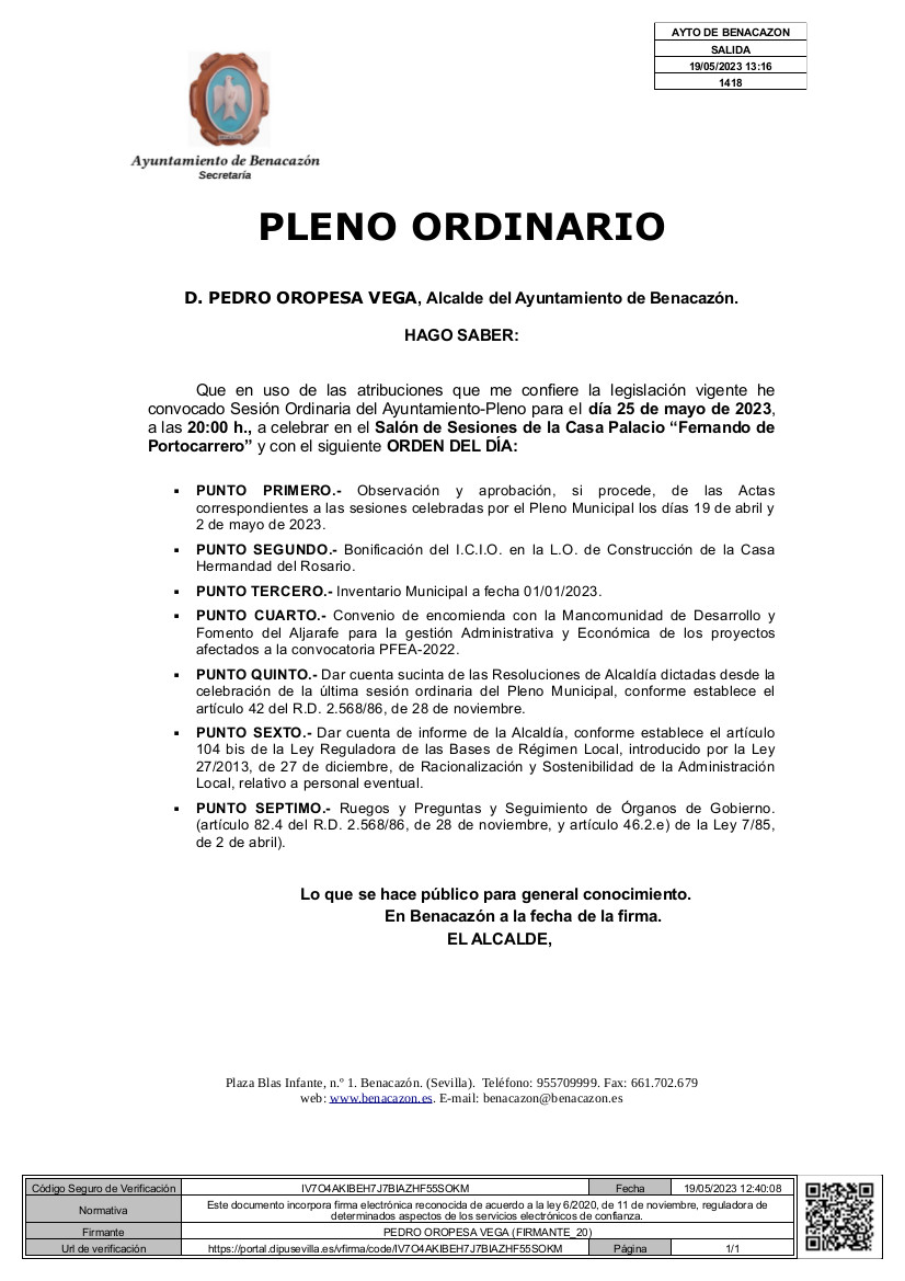El Ayuntamiento de Benacazón informa de la convocatoria de Pleno Ordinario el jueves 25 de mayo de 2023 a las 20:00 h., a celebrar en el Salón de Sesiones de la Casa Palacio 'Fernando de Portocarrero', con el siguiente Orden del Día.