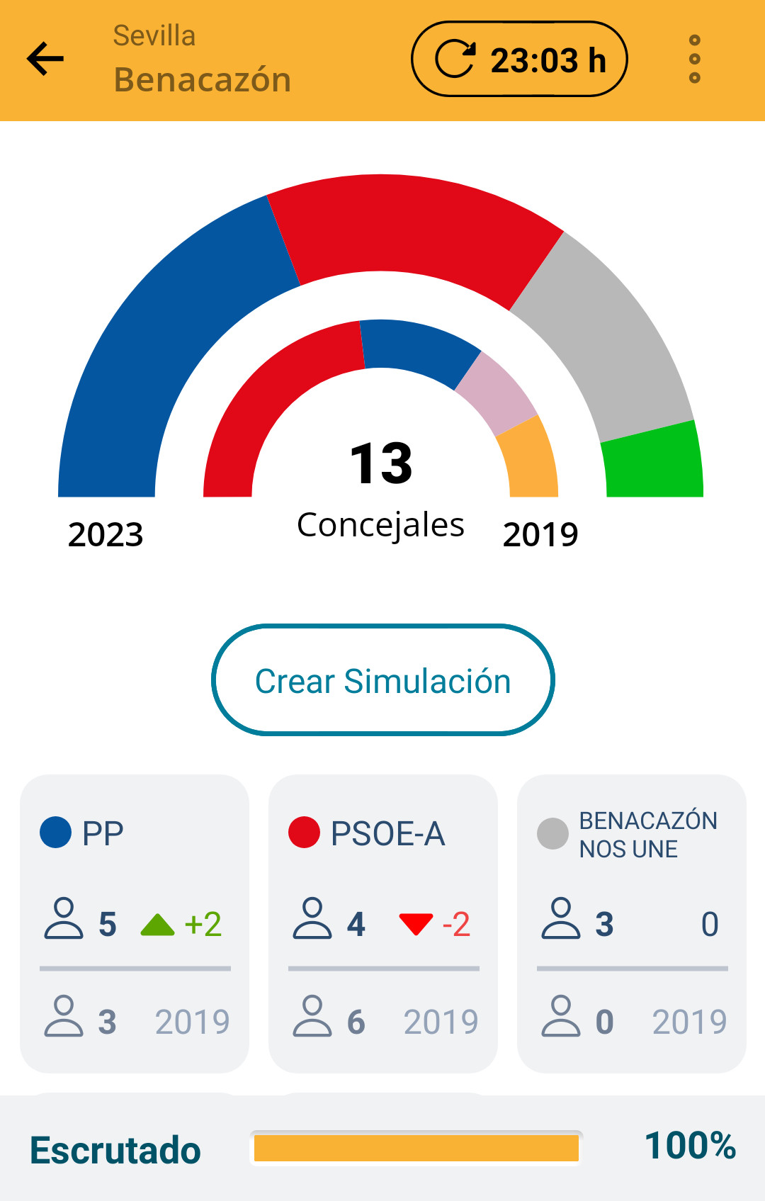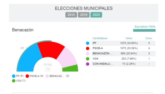 El Ayuntamiento de Benacazón informa de los resultados en nuestra localidad en las Elecciones Municipales, celebradas ayer domingo 28 de mayo de 2023, en las que el PP de Benacazón ha obtenido el máximo número de votos: PP (1.075 votos, 5 concejales), PSOE-A (1.073 votos, 4 concejales), BENACAZÓN NOS UNE (669 votos, 3 concejales), VOX (252 votos, 1 concejal), CON ANDALUCÍA (73 votos).