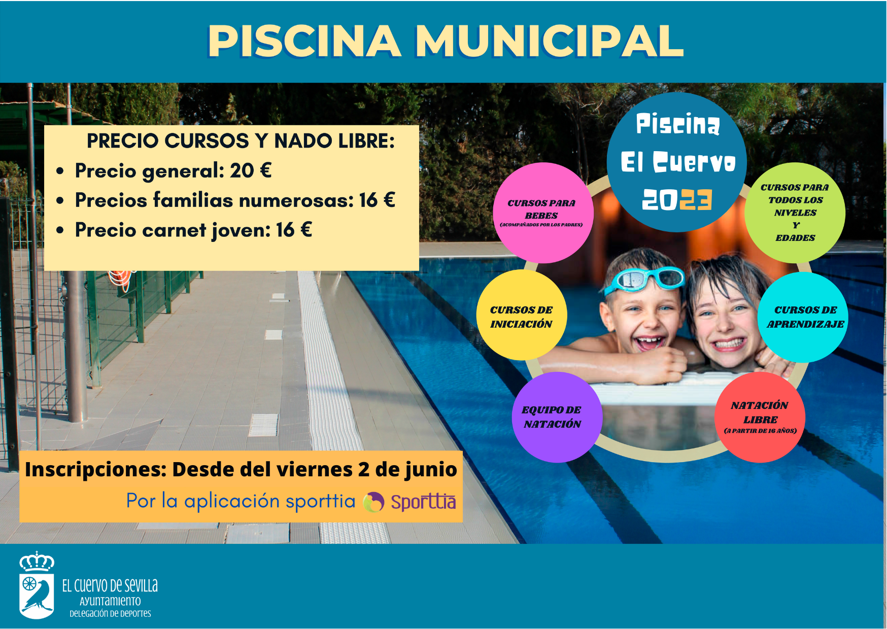 Desde el viernes 2 de junio, la Delegación de Deportes abre el periodo de inscripciones para los cursos de natación de verano (meses de julio y agosto) en la Piscina Municipal de El Cuervo.