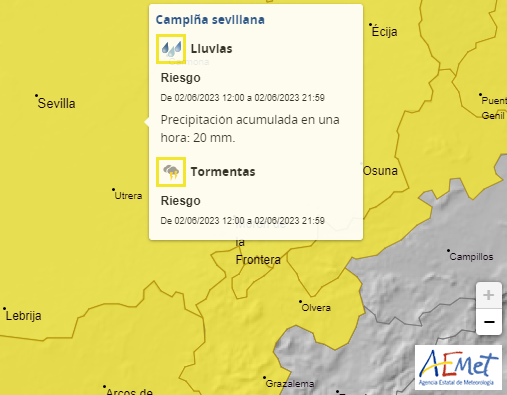 La Agencia Estatal de Meteorología establece el aviso amarillo por lluvia y tormentas, el viernes 2 de junio de 12 a 22 horas. La probabilidad es del 40 a 70%. Precipitación acumulada en una hora: 20 mm.