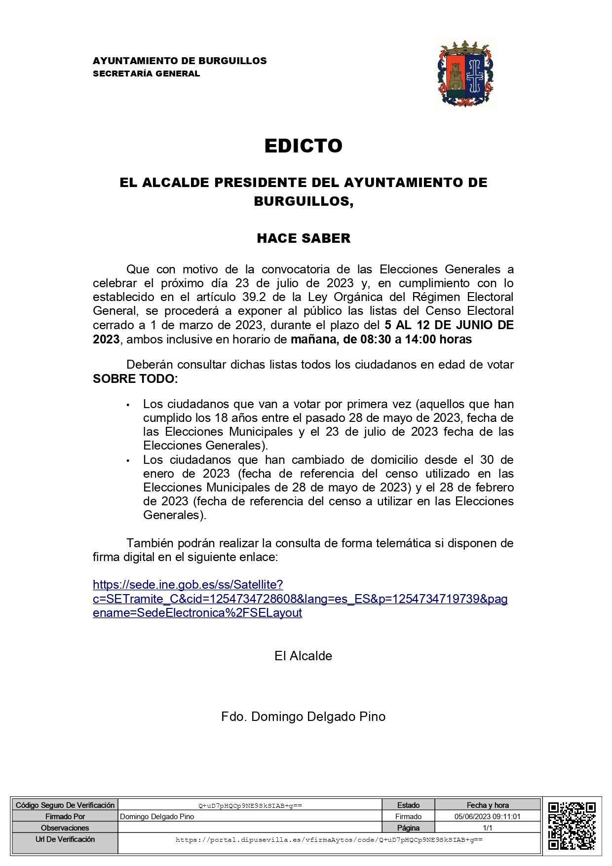 Que con motivo de la convocatoria de las Elecciones Generales a celebrar el próximo día 23 de julio de 2023 y, en cumplimiento con lo establecido en el artículo 39.2 de la Ley Orgánica del Régimen Electoral General, se procederá a exponer al público las listas del Censo Electoral cerrado a 1 de marzo de 2023, durante el plazo del 5 AL 12 DE JUNIO DE 2023, ambos inclusive en horario de mañana, de 08:30 a 14:00 horas