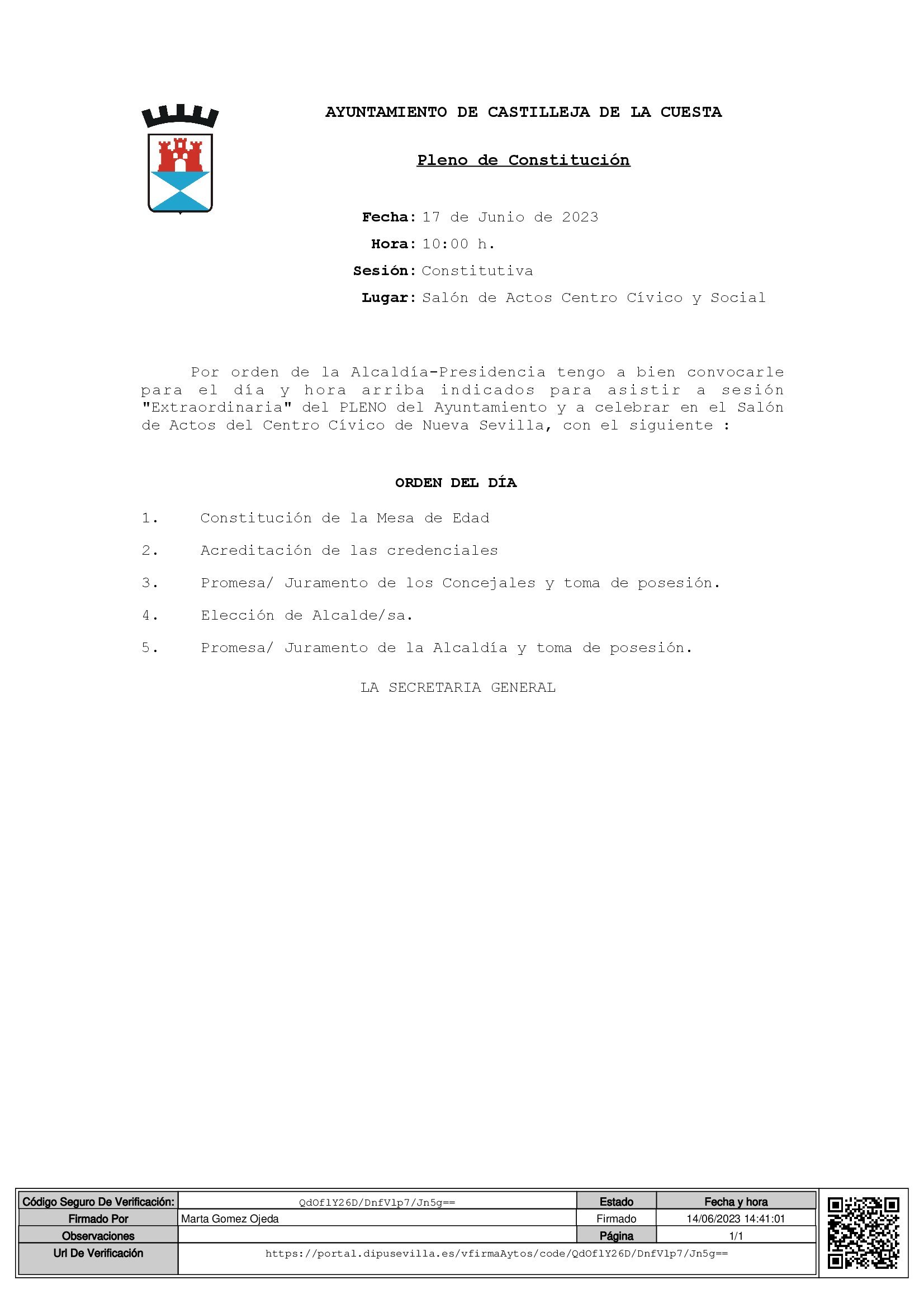 Pleno Extraordinario de constitucion del Ayuntamiento de Castilleja de la Cuesta.