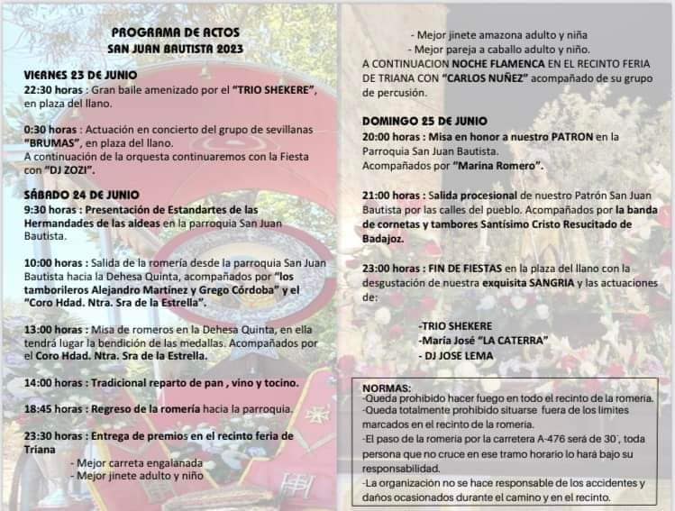 Un intenso fin de semana, en el que se desarrollará un amplio programa organizado con mucho gusto y trabajo por parte del Grupo Parroquial de San Juan Bautista, siendo el sábado y domingo los días más importantes de estas fiestas con la salida de la romería y la Función Principal a San Juan Bautista respectivamente.