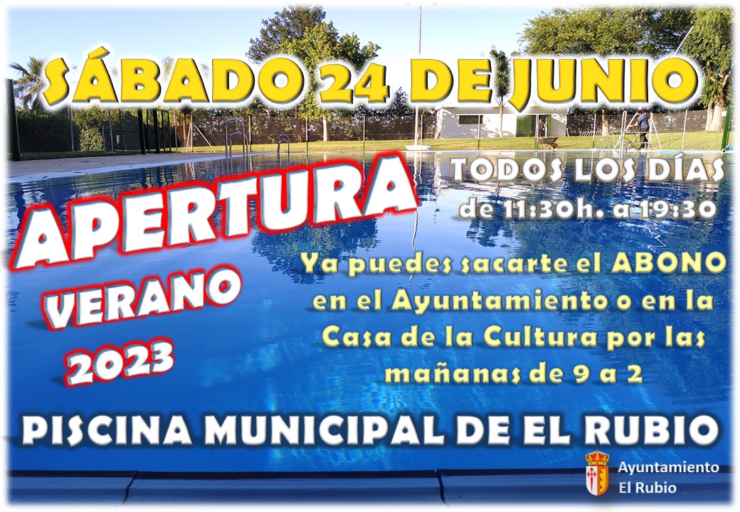 La PISCINA MUNICIPAL DE EL RUBIO comienza la temporada 2023 el próximo sábado 24 de junio de 11:30 de la mañana a 19:30 de la tarde de forma ininterrumpida.