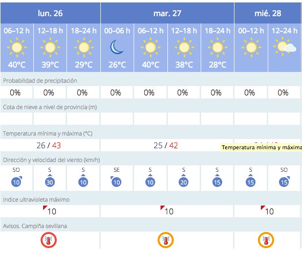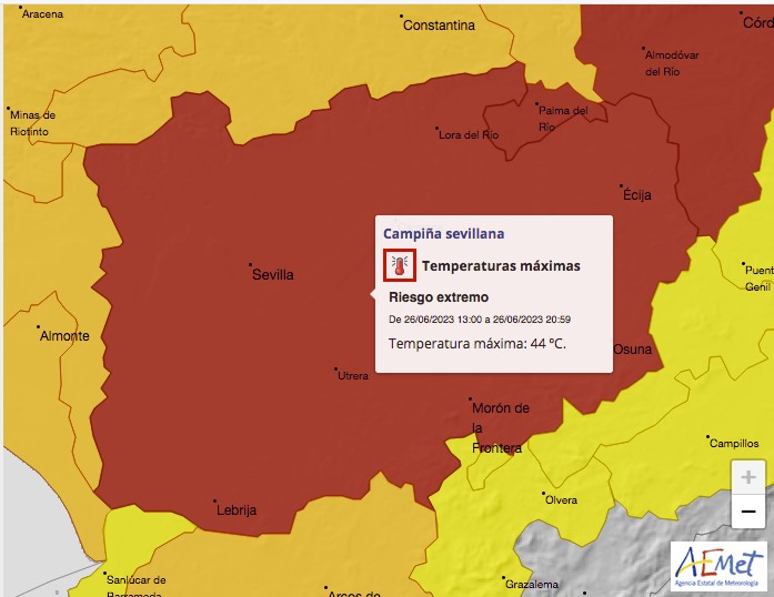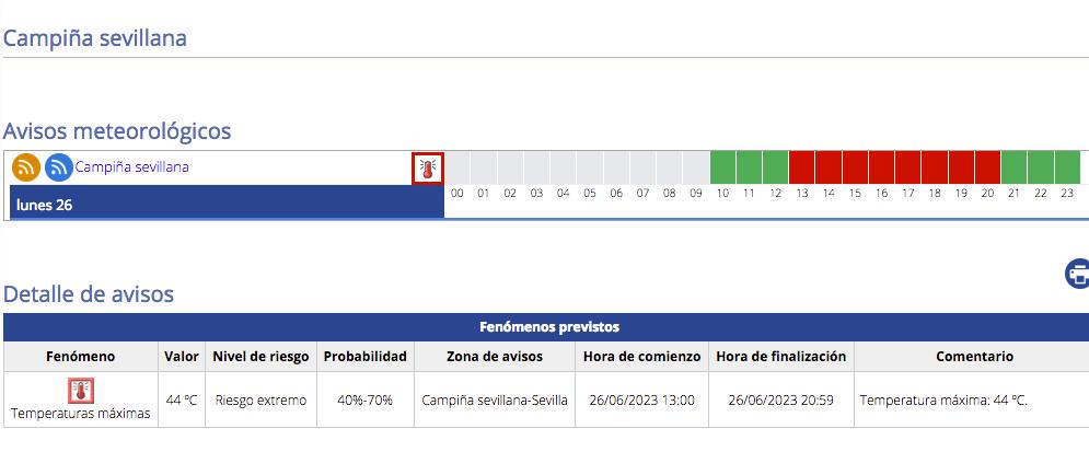 Hoy, lunes 26 de junio, la Agencia Estatal de Meteorología indica que El Rubio se encuentra en alerta ROJA desde la 1 del mediodía hasta las 9 de la noche donde las temperaturas superarán los 44ºC en el municipio.
