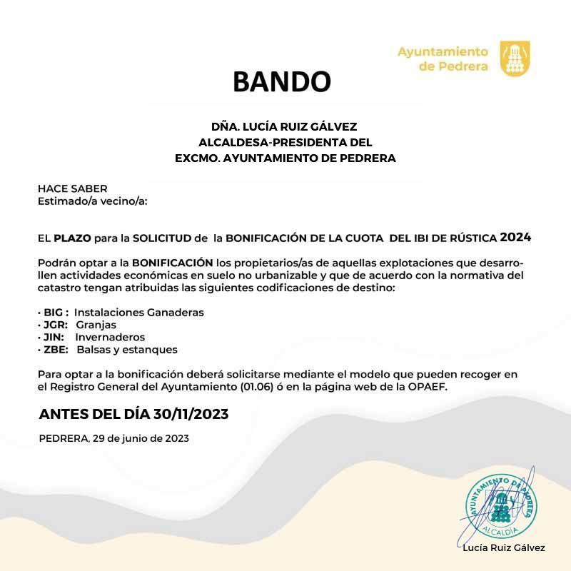 El Ayuntamiento de Pedrera ha publicado un nuevo bando municipal en el que se informa de la apertura del plazo para la bonificación de la cuota del IBI para los inmuebles que desarrollen actividades económicas en suelo no urbanizable.