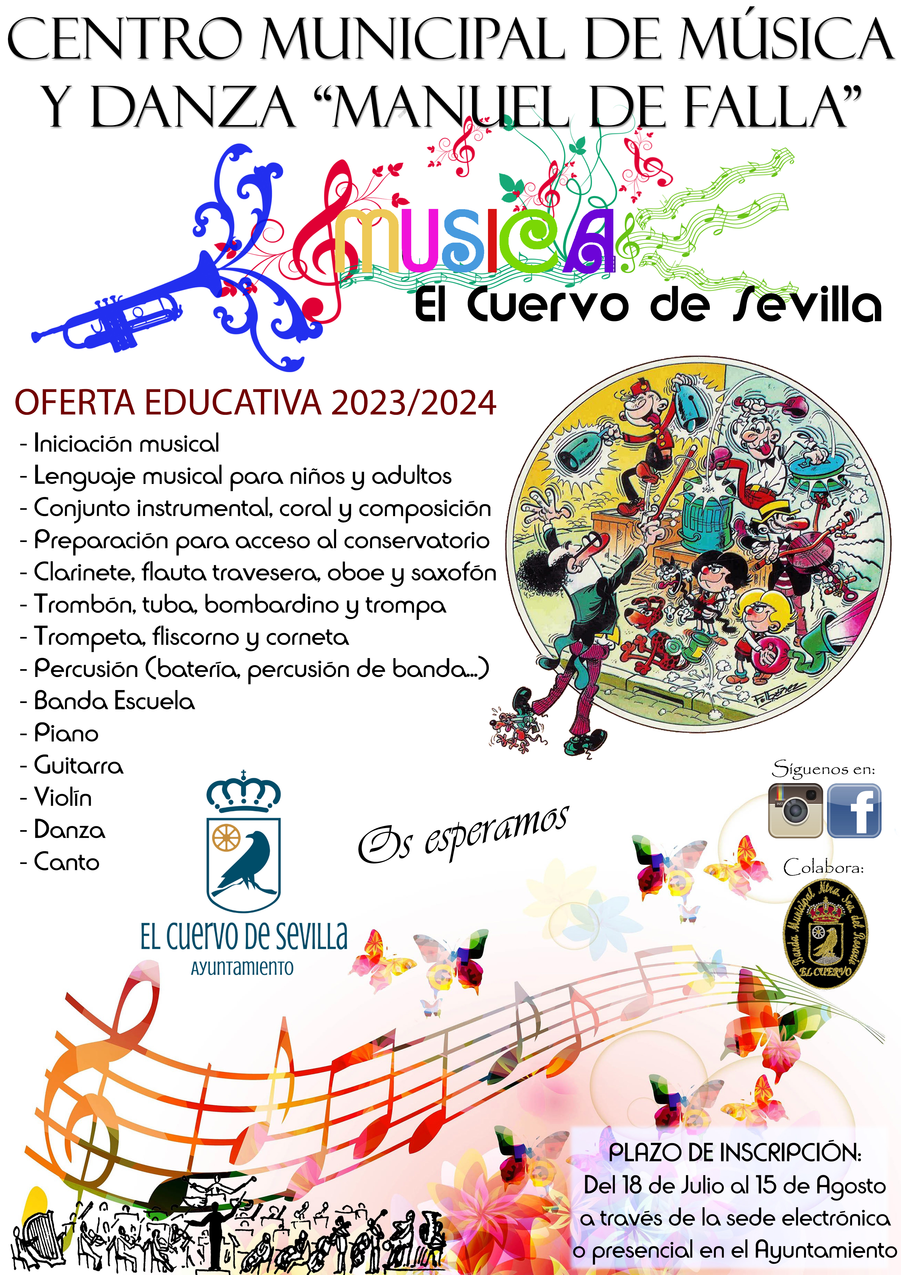 Ya esta abierto el plazo (desdel el 18 de julio hasta el 15 de agosto) para inscribirse en las disciplinas del Centro de Música y Danza Manuel de Falla (Escuela Municipal de Música y Danza) dirigido al nuevo alumnado, para el curso 2023-2024