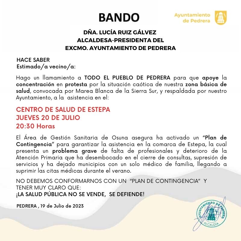 La Alcaldesa, Lucía Ruiz, acaba de emitir un bando municipal haciendo un llamamiento a la población para que se sume a la concentración convocada por Marea Blanca de la Sierra Sur para protestar "por la situación caótica de nuestra zona básica de salud".