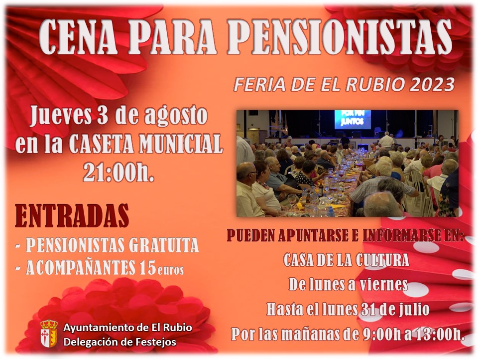 El próximo jueves 3 de agosto, víspera de la FERIA DE EL RUBIO 2023, se celebra la tradicional cena de pensionistas en la Caseta Municipal a partir de las 9 de la noche.