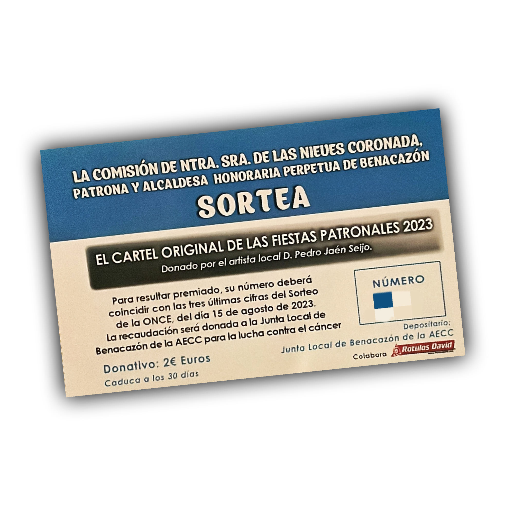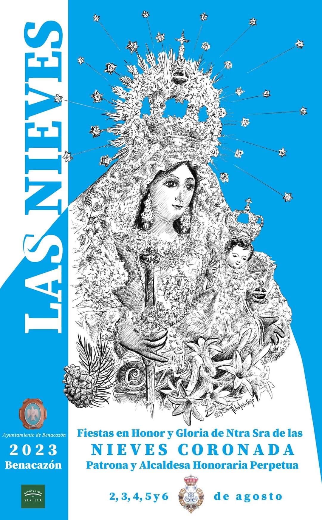 El Ayuntamiento de Benacazón informa que el dibujo original, motivo central del diseño del Cartel de nuestras Fiestas Patronales en honor a la Virgen de las Nieves Coronada, ha sido donado por el autor Pedro Jaén Seijo a la Junta Local de la Asociación Española Contra el Cáncer, con la finalidad de realizar un sorteo a beneficio de la AECC de Benacazón. El número ganador deberá coincidir con las tres últimas cifras del Sorteo de la ONCE del día 15 de agosto de 2023.