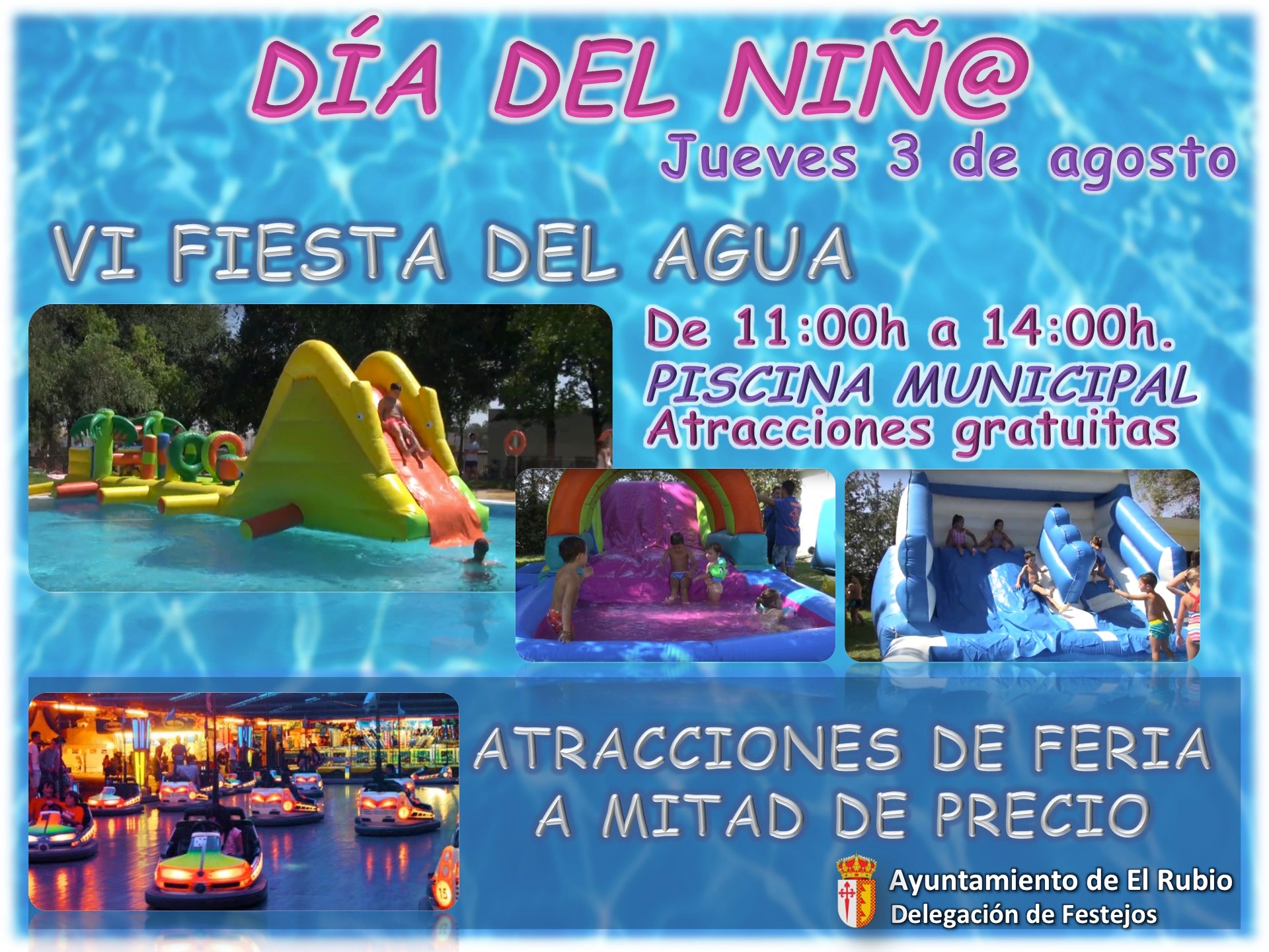 El próximo jueves, todos los niños y niñas podrán disfrutar un año más de la FIESTA DEL AGUA que se celebrará en la piscina municipal de 11:00h. a 14:00h. En ella podrán jugar y refrescarse en los colchones de agua