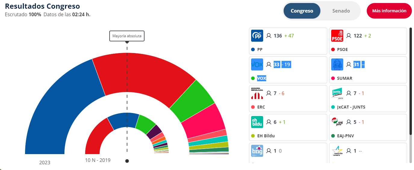 Con el 99% del escrutinio de los votos, los primeros resultados sitúan al Partido Popular como primera fuerza política de este 23-J. Los populares obtendrían 136 escaños en el Congreso de los Diputados, lejos de los 176 necesarios para conseguir la mayoría absoluta. Por el momento, con los 33 escaños que tendría Vox, no alcanzarían para sumar mayoría y formar Gobierno.