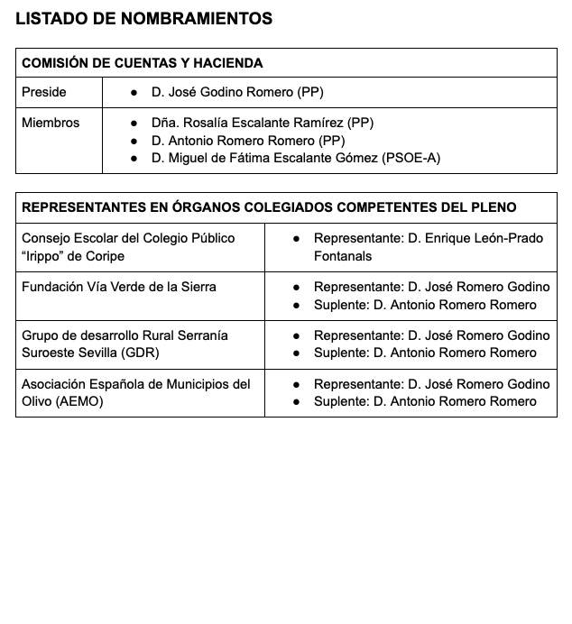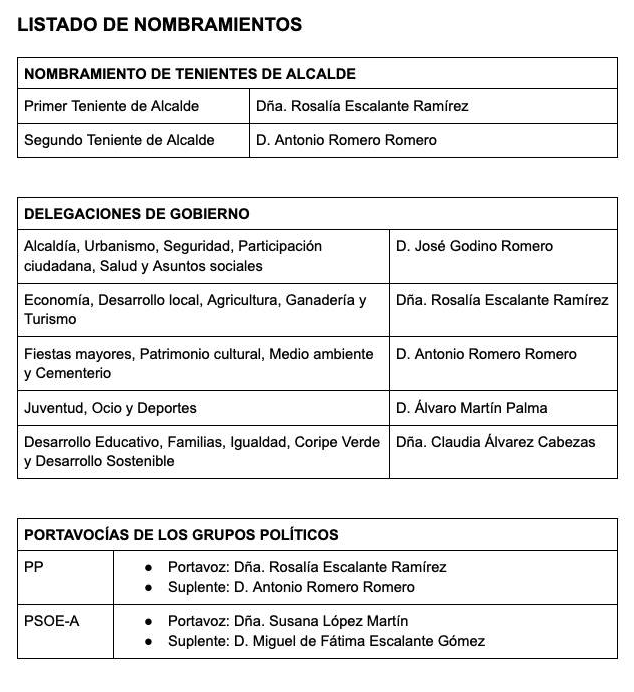 - Alcalde: D. José Godino Romero: Urbanismo, Seguridad, Participación ciudadana, Salud y Asuntos sociales