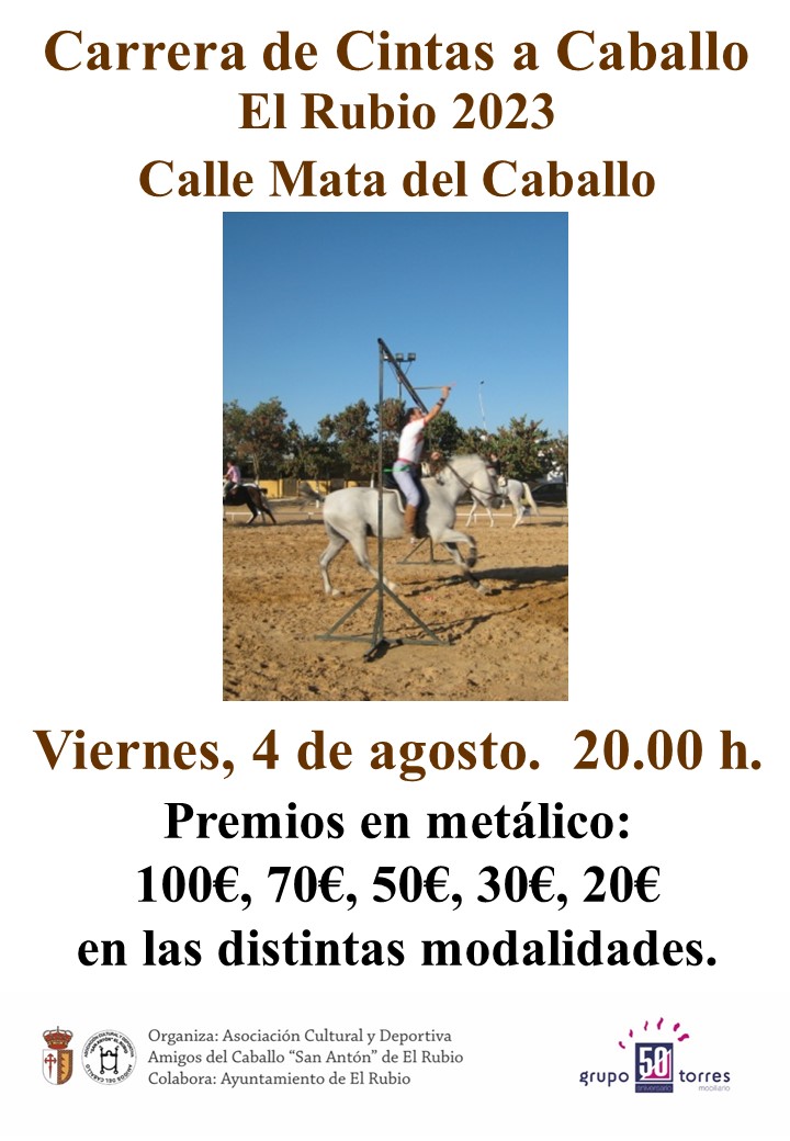 FERIA Y FIESTAS DE EL RUBIO 2023   Como cada año el primer fin de semana de agosto El Rubio celebra su FERIA.   Los primeros días de la semana que viene se disputarán diferentes competiciones deportivas como antesala al jueves, "VÍSPERA DE FERIA", que festeja el Día de l@S NIÑ@S y JÓVENES con actividades como la FIESTA DEL AGUA o la APERTURA DE LA CASETA DE LA JUVENTUD. Pero también es el día de los más mayores que celebran la tradicional "Cena de los pensionistas".   Un año más, el primer día de feria arranca a primera hora con la DIANA, animada por la "Batucada Latidos", el día continuará con la CARRERA DE CINTAS A CABALLO, la animación de la ORQUESTA DREAMS y la actuación especial de OBK.   El sábado 5 de agosto, el PASEO DE CABALLOS en sus distintas modalidades vuelve a recorrer las calles principales de nuestro pueblo. Por la noche la ORQUESTA DREAMS volverá a animar la caseta y seguidamente, MARISOL BIZCOCHO realizará una actuación muy especial.   Finalmente, el domingo 6 de agosto, se celebrará el clásico concurso de HABILIDAD CON EL TRACTOR, vuelve la animación de la ORQUESTA DREAMS y la actuación especial de de ROCKOPOP para culminar con el GRAN COTILLÓN Y FIN DE FIESTAS.
