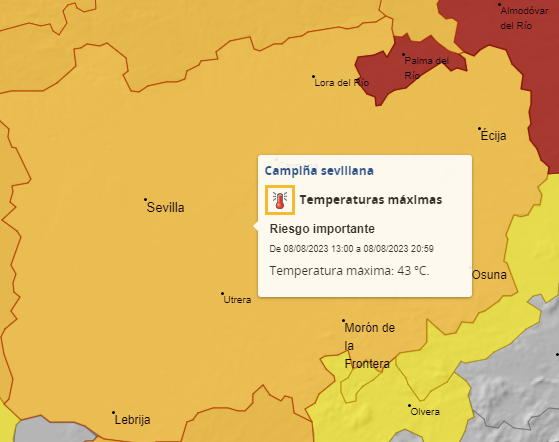 La Agencia Estatal de Meteorología ha activado el aviso naranja por altas temperaturas en la campiña sevillana, hasta el sábado 12 de agosto. La temperatura máxima prevista oscila entre los 40-44 ºC. Las temperaturas mínimas también serán muy elevadas durante el episodio, con noches conocidas como tropicales, por encima de 20 ºC.