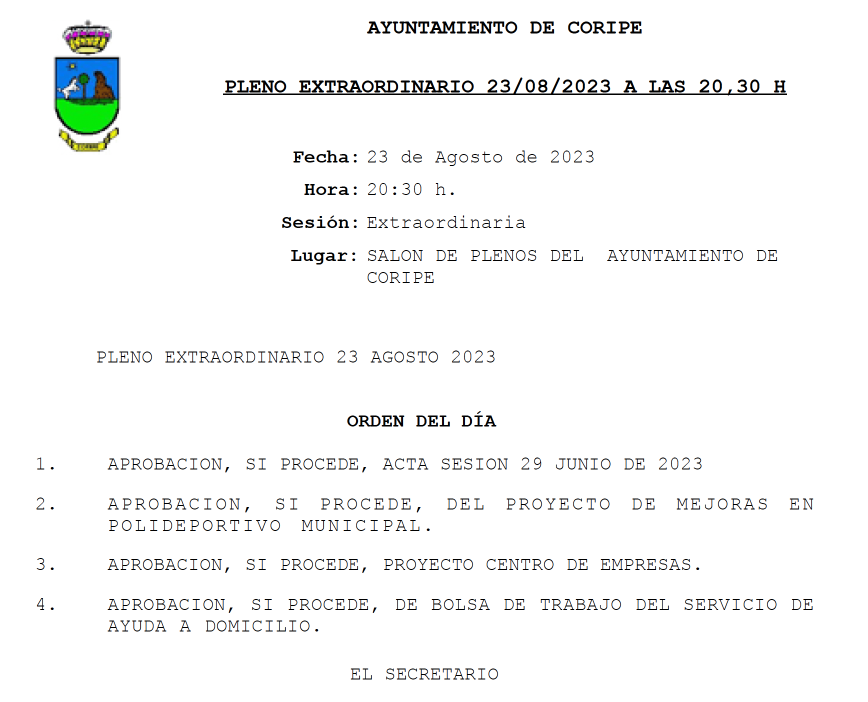 Durante el pleno extraordinario de hoy miércoles han quedado aprobados por unanimidad los siguientes puntos,