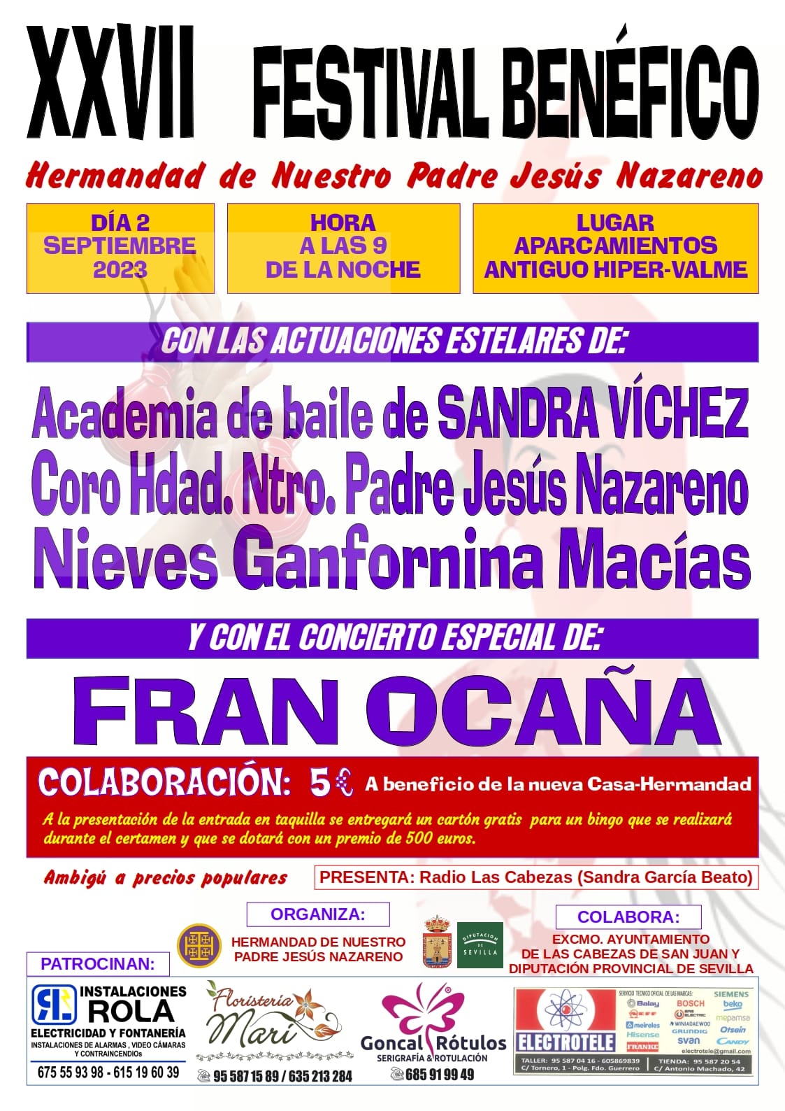 Una actividad que organiza la Hermandad Sacramental de Jesús Nazareno, María Santísima de las Angustias y San Juan Evangelista y que cuenta con la colaboración de la Delegación de Cultura del Excmo. Ayuntamiento de Las Cabezas de San Juan. A partir de las nueve de la noche se podrá disfrutar de buena música y el mejor ambiente de preferia con artistas locales y el cantante Fran Ocaña. Esta actividad se encuentra dentro del Programa Cultura al Fresquito del Consistorio.