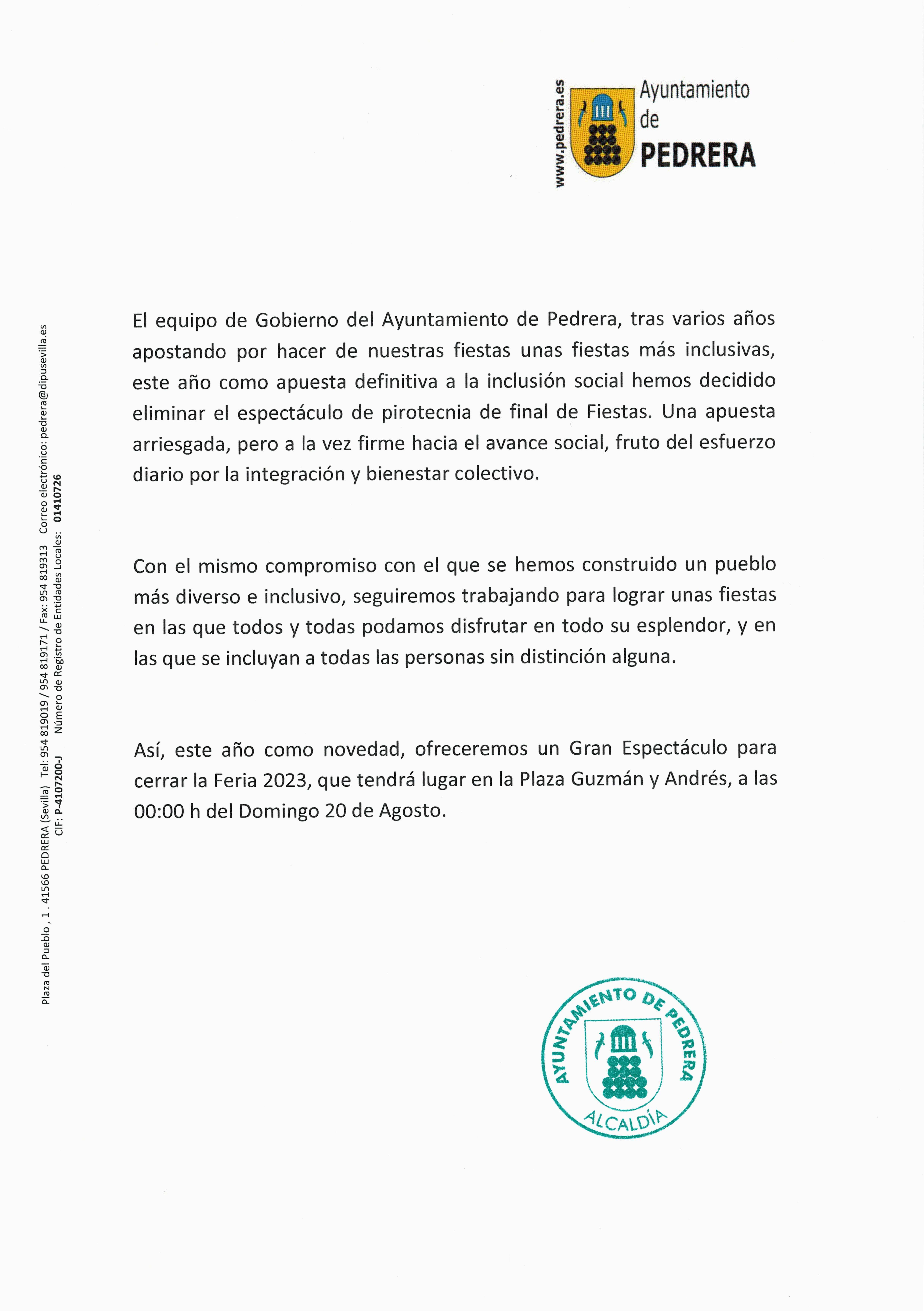 El Ayuntamiento de Pedrera ha puesto en marcha una iniciativa para el fin de feria, para promover "la inclusión social" haciendo una "fiesta más inclusiva", eliminando el espectáculo de pirotecnia de final de Fiestas. Una medida que busca evitar molestias y favorecer la tranquilidad de las personas que sufren hipersensibilidad a los estímulos de su entorno.