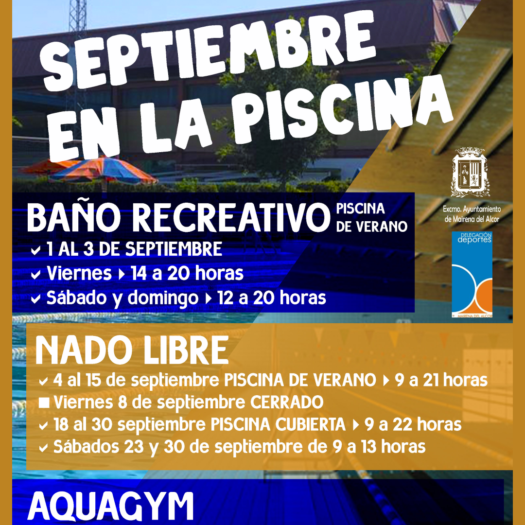 Imagen Imágenes Ubicación Categoría noticia Deportes Mostrar en el carrusel de la sección No Fecha Mar, 29/08/2023 - 09:30 Más información http://www.mairenadelalcor.es/es/actualidad/noticias/Septiembre-en-la-piscina-0…
