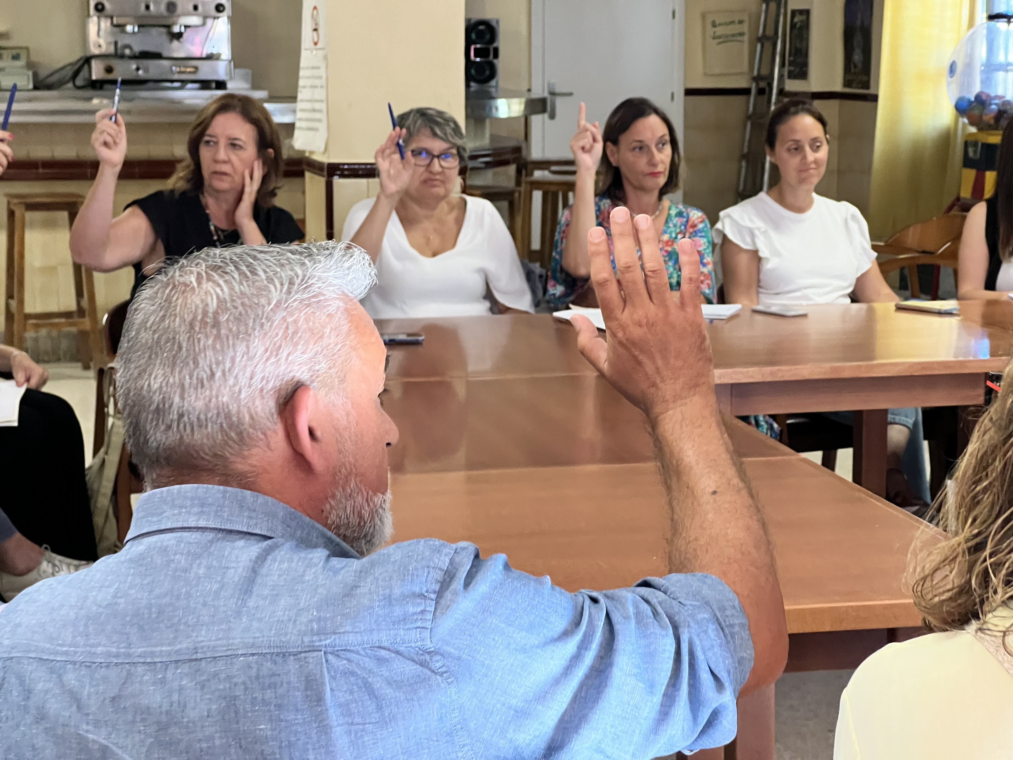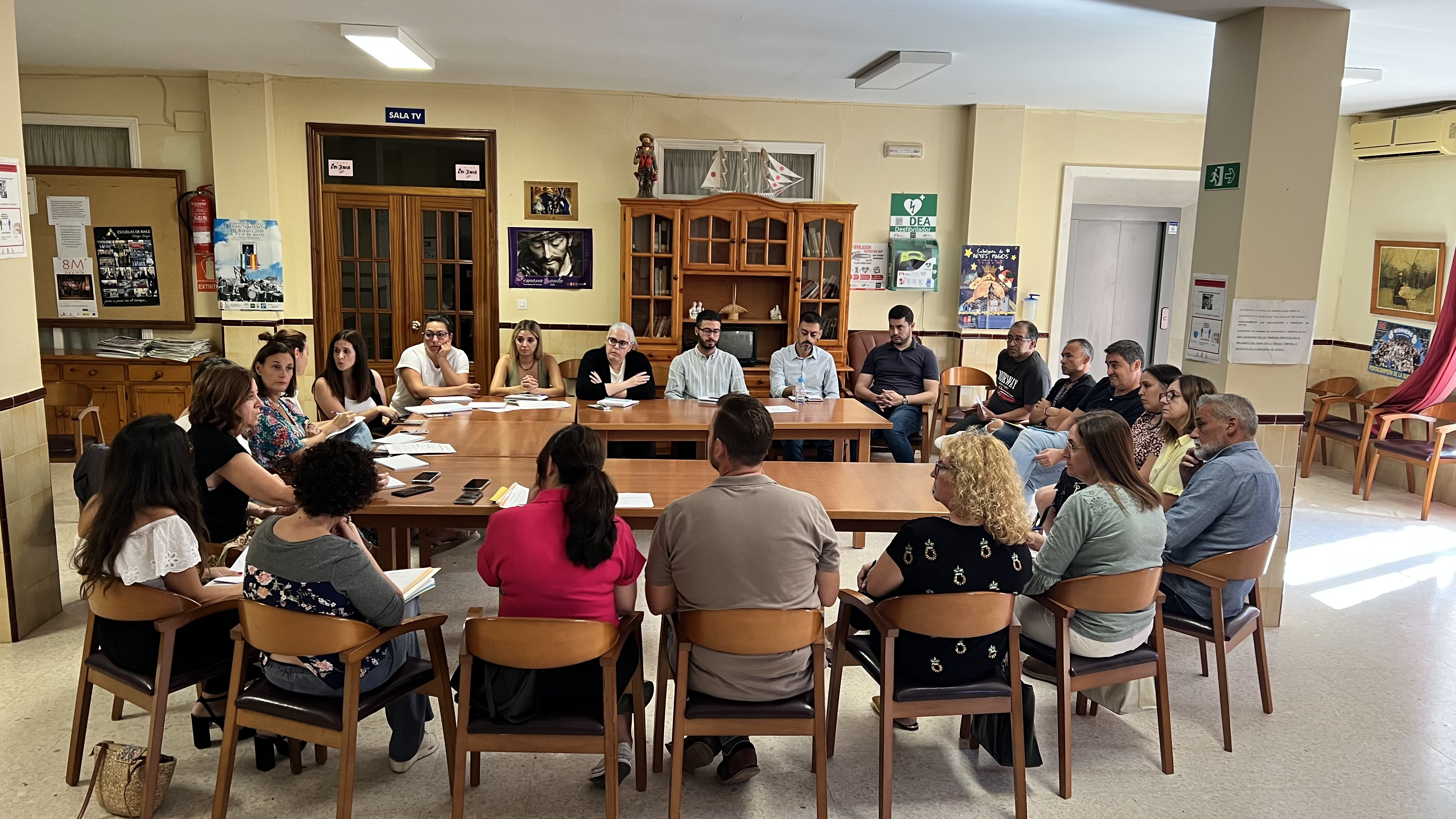 El salón del Centro de Participación activa El Abuelo, antiguo Hogar del pensionista, ha sido el lugar elegido para llevar a cabo esta reunión a la que han asistido el Gobierno local al completo y representantes de los trabajadores municipales de las diferentes áreas.