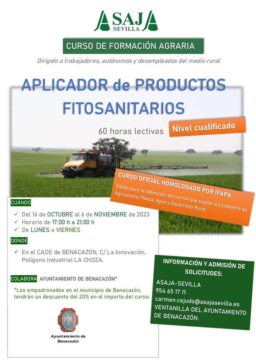 Si necesitas o deseas obtener el carné oficial de "Aplicador de Productos fitosanitarios nivel cualificado", puedes apuntarte al curso que ASAJA-Sevilla impartirá en el CADE de BENACAZON (C/ La Innovación, Polígono Industrial LA CHOZA), en colaboración con el Ayuntamiento de Benacazón, a través de la Agencia de Desarrollo Local, desde el día 16 de