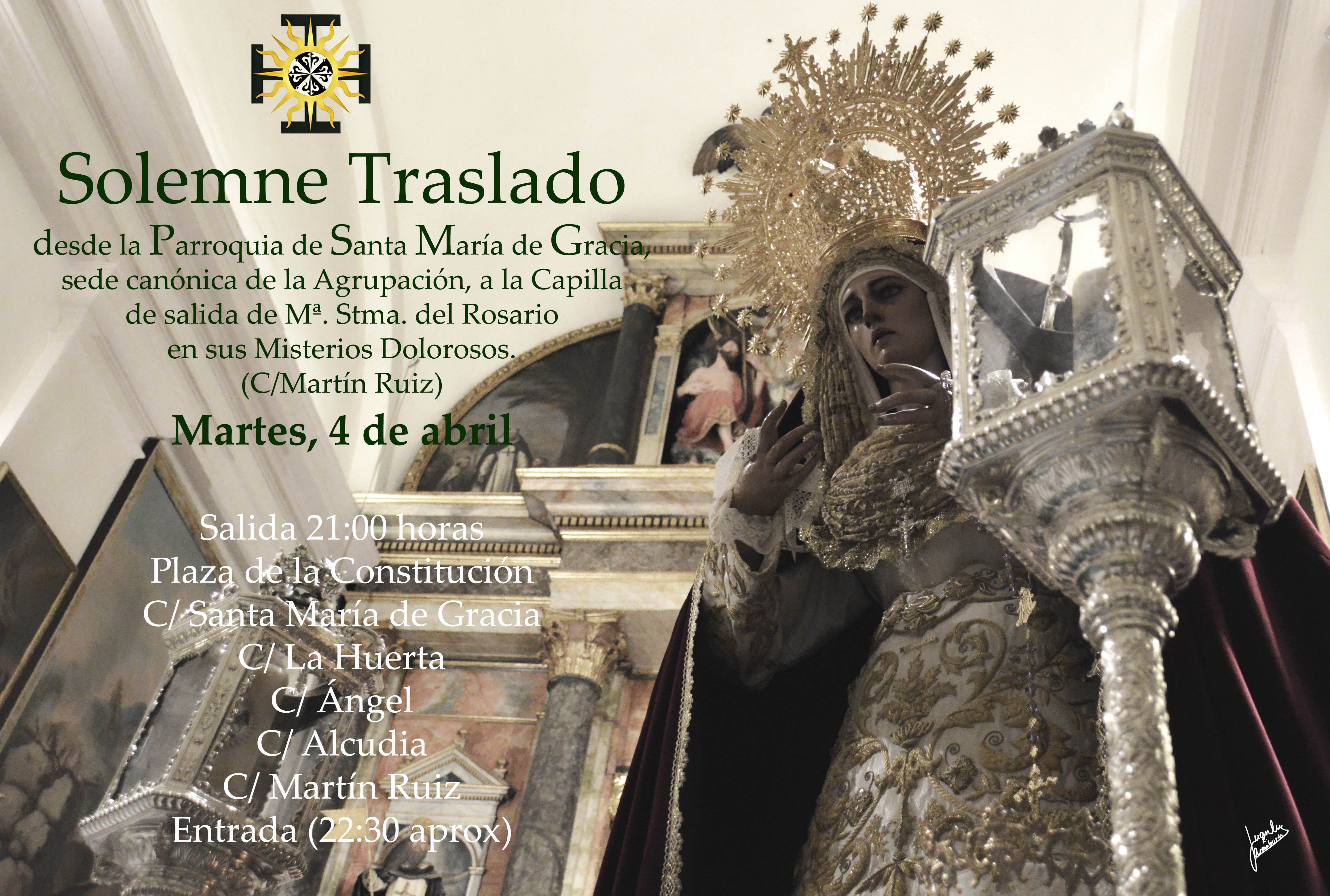 21:00 horas, el traslado de su titular María Santísima del Rosario en sus Misterios Dolorosos, desde