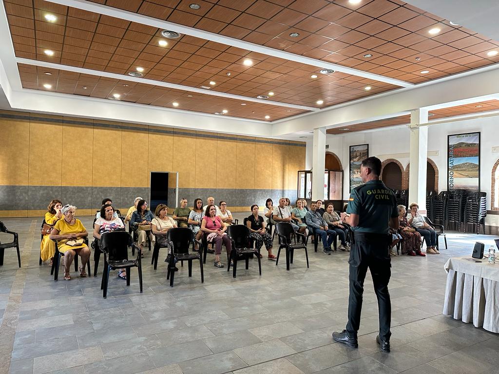 Un agente de la Guardia Civil ha participado este lunes en una charla, enmarcada en el Plan Mayor de Seguridad, que se celebró en la Caseta Municipal. Se trata de un programa dirigido a las personas mayores con el objetivo de ofrecer consejos y asesoramiento para conseguir que estas personas puedan prevenir amenazas y perfeccionar la respuesta ante estas posibles amenazas que puedan tener las personas mayores.