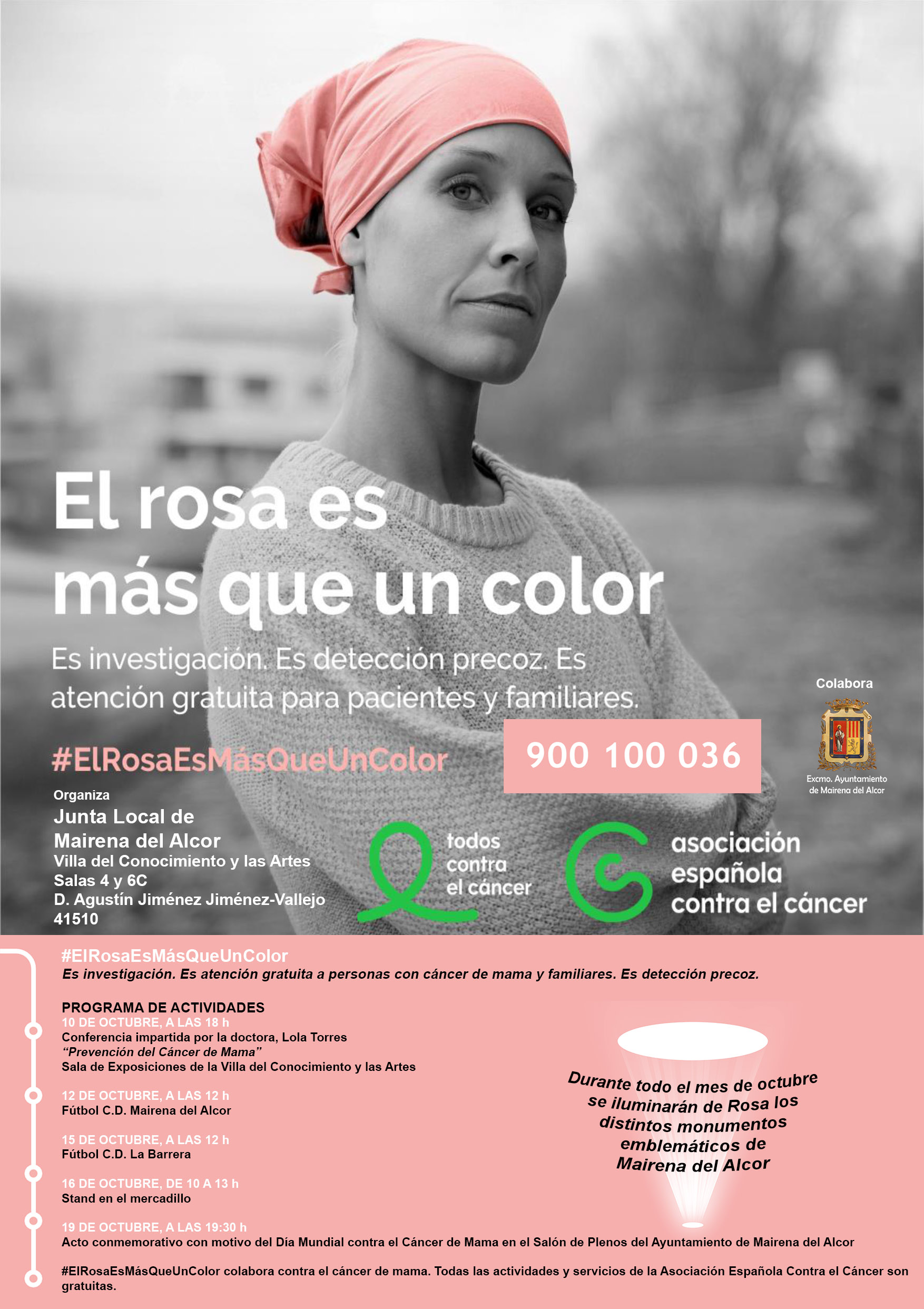La conferencia impartida por la doctora Lola Torres 'Prevención del Cáncer de Mama' tendrá lugar el día 10 de octubre a las 18 horas en la Villa del Conocimiento y las Artes. Los días 12 y 15 de octubre a las 12 horas habrá sendos partidos de fútbol del CD Mairena y la Barrera CF dedicados a la causa. El tradicional stand informativo se instalará en el mercadillo de los lunes el día 16 de octubre de 10 a 13 horas.