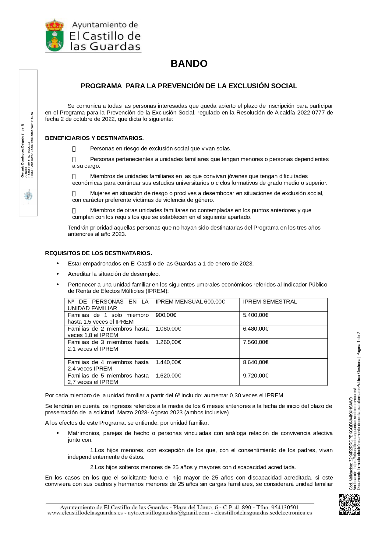 Se comunica a todas las personas interesadas que queda abierto el plazo de inscripción para participar en el Programa para la Prevención de la Exclusión Social, regulado en la Resolución de Alcaldía 2022-0777 de fecha 2 de octubre de 2022.