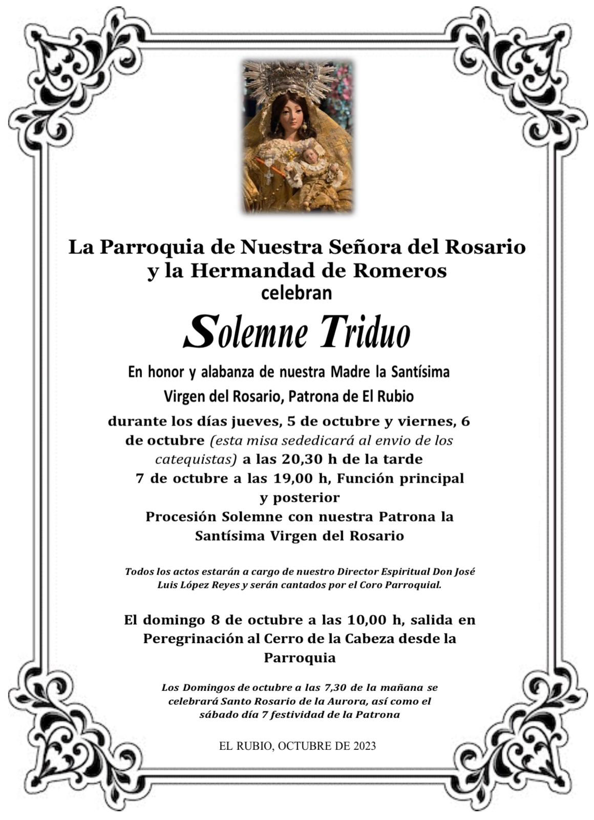 El jueves, 5 de octubre, dará comienzo un solemne TRIDUO, a partir de las 20:30h.