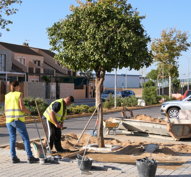 Visita de supervisión del alcalde, Juanma López, y la concejala de Obras y Medio Ambiente, Ana María Guillén, a los trabajos de accesibilidad y de arboleda que el Ayuntamiento de Mairena del Alcor está realizando en las avenidas Andrés Almonaster y Roxas e Igualdad para optimizar estas vías, con cargo al Plan de Fomento del Empleo Agrario (PFEA). La previsión es que las obras finalicen antes de final de año.