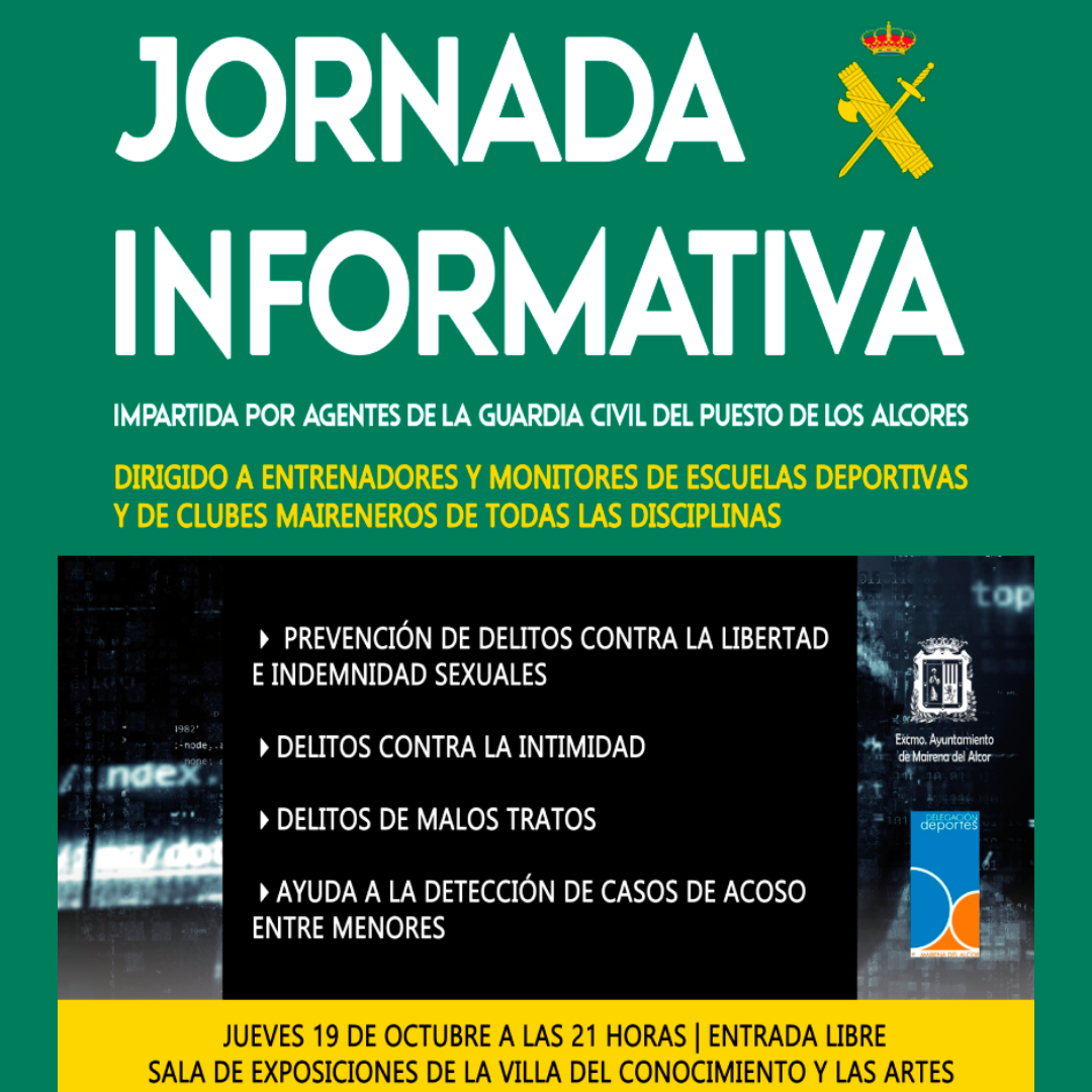 La Guardia Civil del Puesto Principal de Los Alcores impartirá una jornada informativa sobre la prevención de delitos contra la libertad e identidad sexual, delitos contra la intimidad y malos matros y ayuda a la detección de casos de acoso entre menores. Será el 19 de octubre a las 21 horas en la Villa del Conocimiento y las Artes.