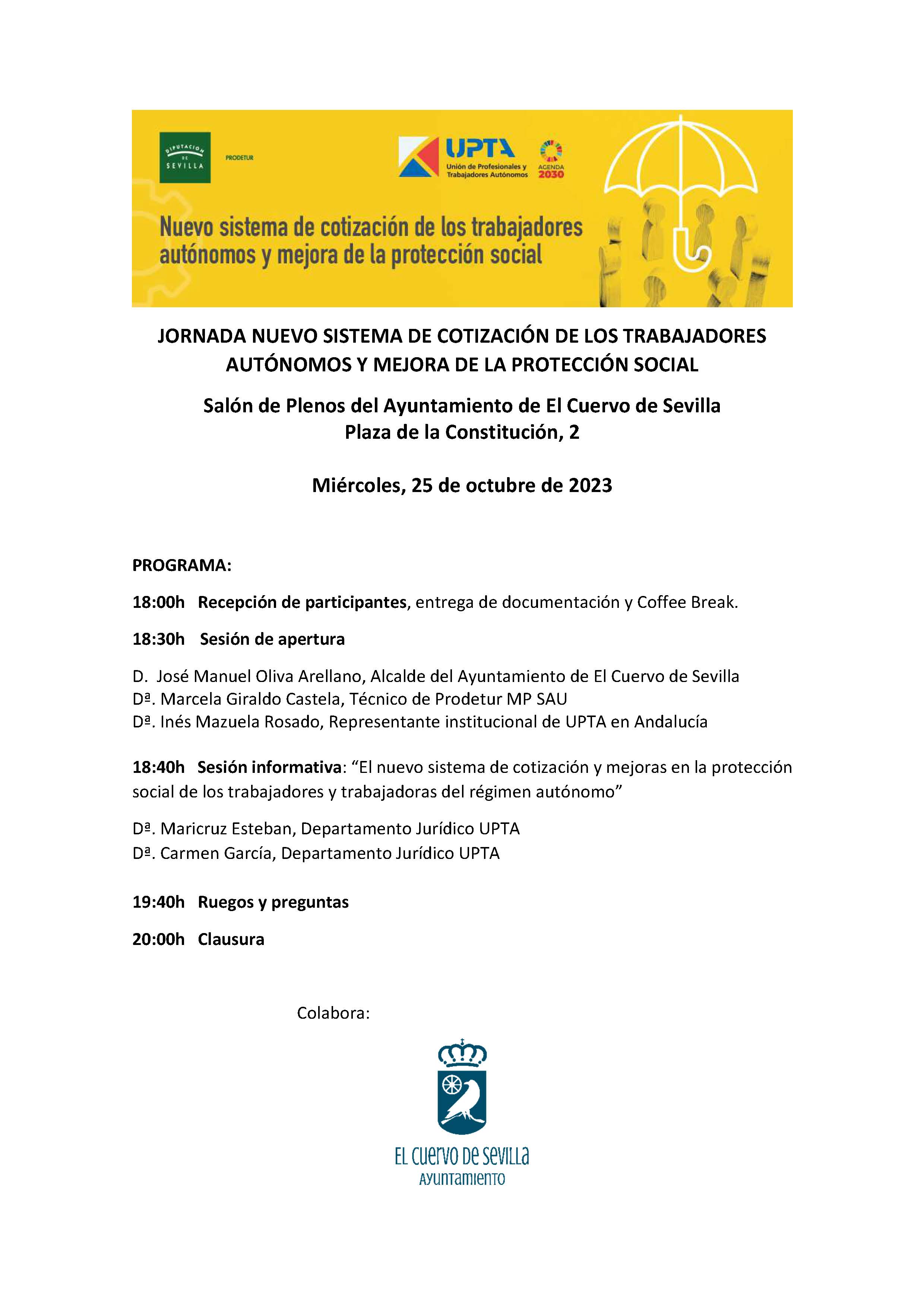 * 18:40h Sesión informativa: "El nuevo sistema de cotización y mejoras en la protección social de los trabajadores y trabajadoras del régimen autónomo"