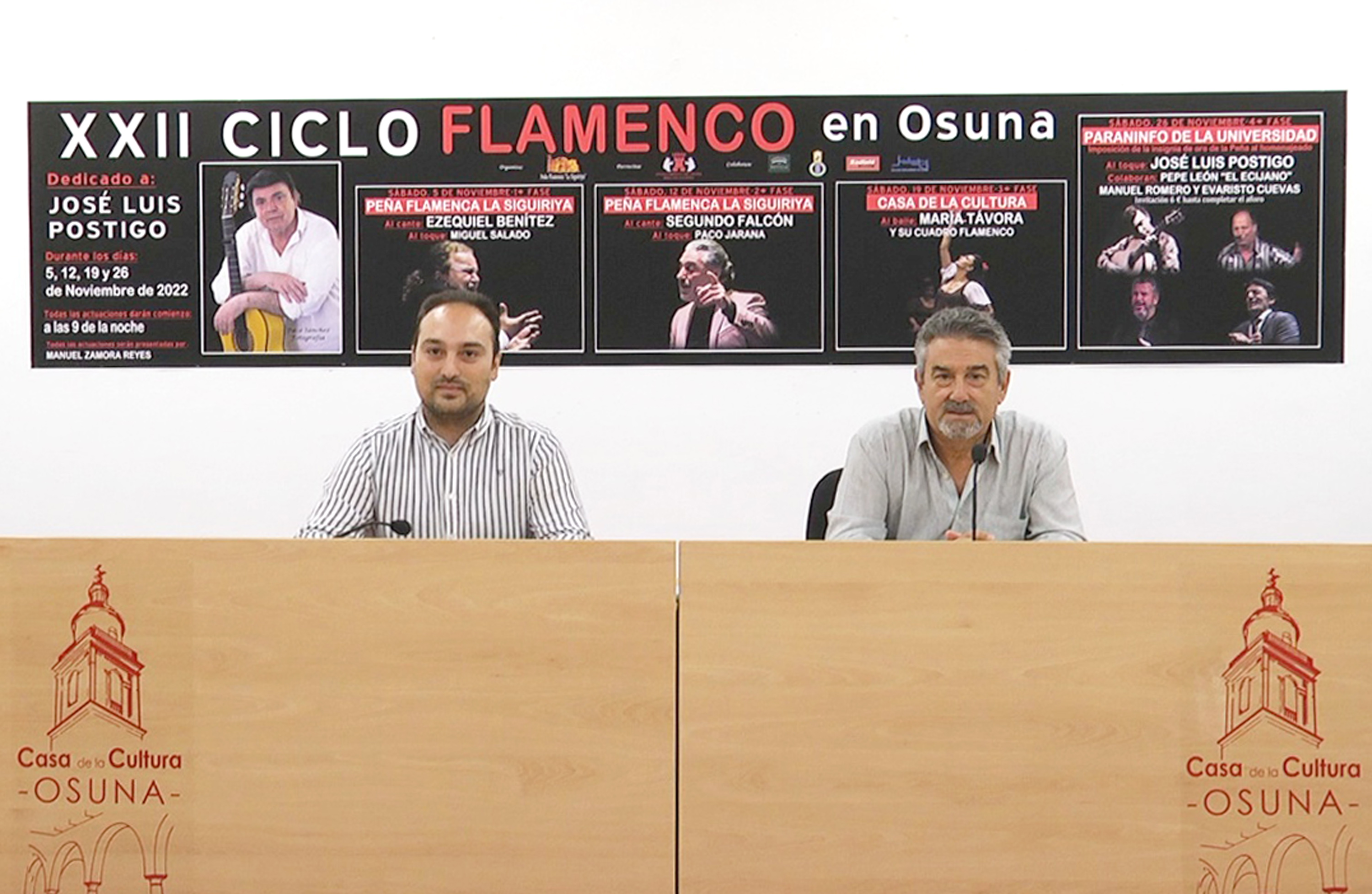 El delegado municipal de Cultura, Jesús Heredia, y el presidente de la Peña Flamenca 'La Siguiriya' han presentado en el salón de la Casa de la Cultura el XXII Ciclo Flamenco de Osuna, todo un clásico ya en el calendario cultural de otoño en la Villa Ducal, y en concreto, en el mes de noviembre.