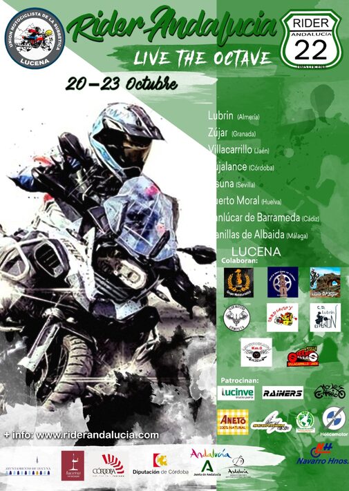 Osuna vuelve a ser testigo de otro gran acontecimiento deportivo como es la VIII Rider Andalucía, uno de los eventos motociclistas en ruta más importantes que cada año se celebran en España, organizado por la Unión Motociclista de la Subbética, y que cuenta con la colaboración del Ayuntamiento de Osuna a su paso por la localidad, la cual compartirá escenarios con otros puntos de parada a lo largo y ancho de toda la geografía andaluza, con más de 1.300 kilómetros por carreteras que completan el trazado.