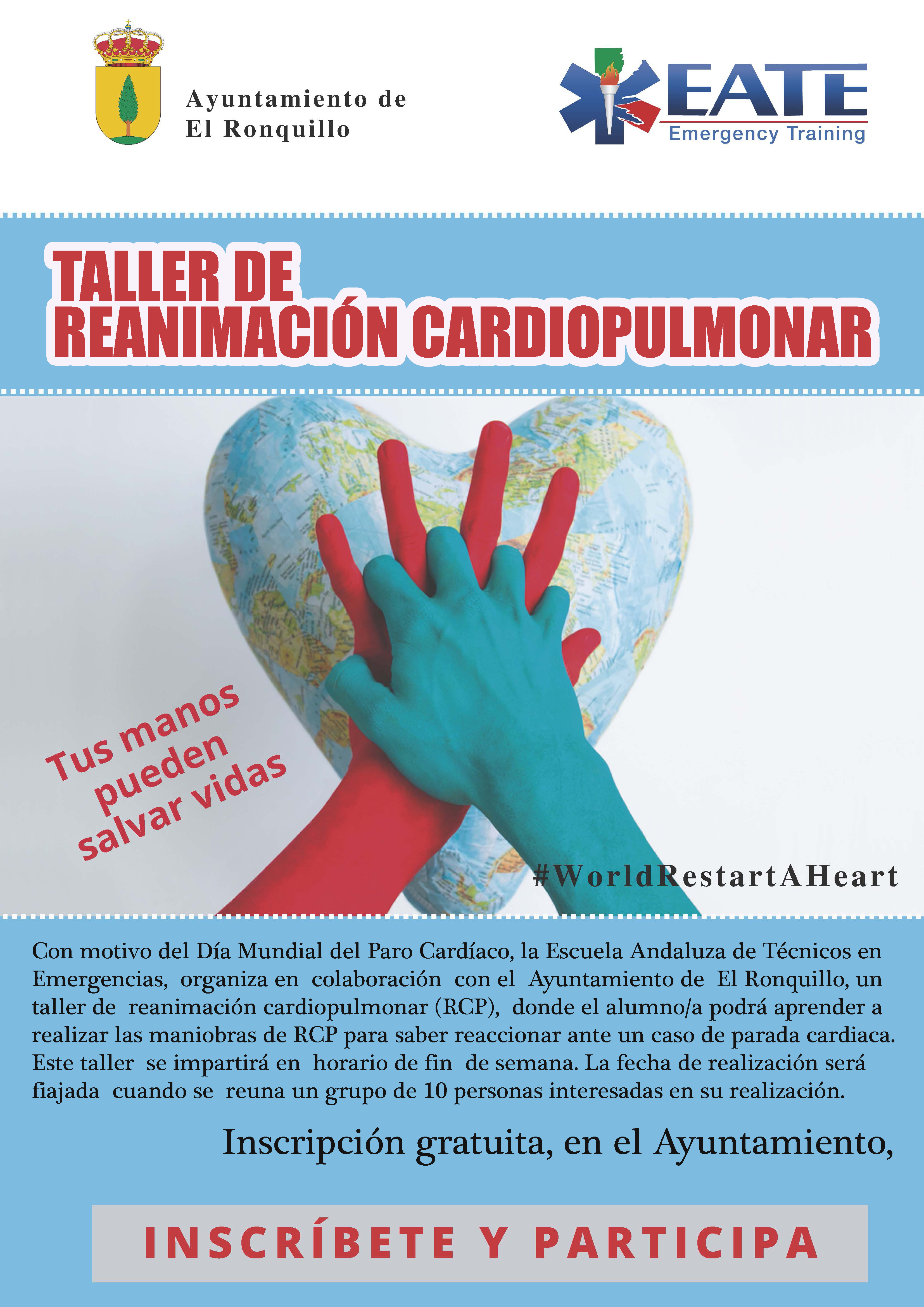 La Escuela Andaluza de Técnicos en Emergencias, organiza en colaboración con el Ayuntamiento de El Ronquillo, un taller de reanimación cardiopulmonar (RCP), donde el alumno/a podrá aprender a realizar las maniobras de RCP para saber reaccionar ante un caso de parada cardiaca.
