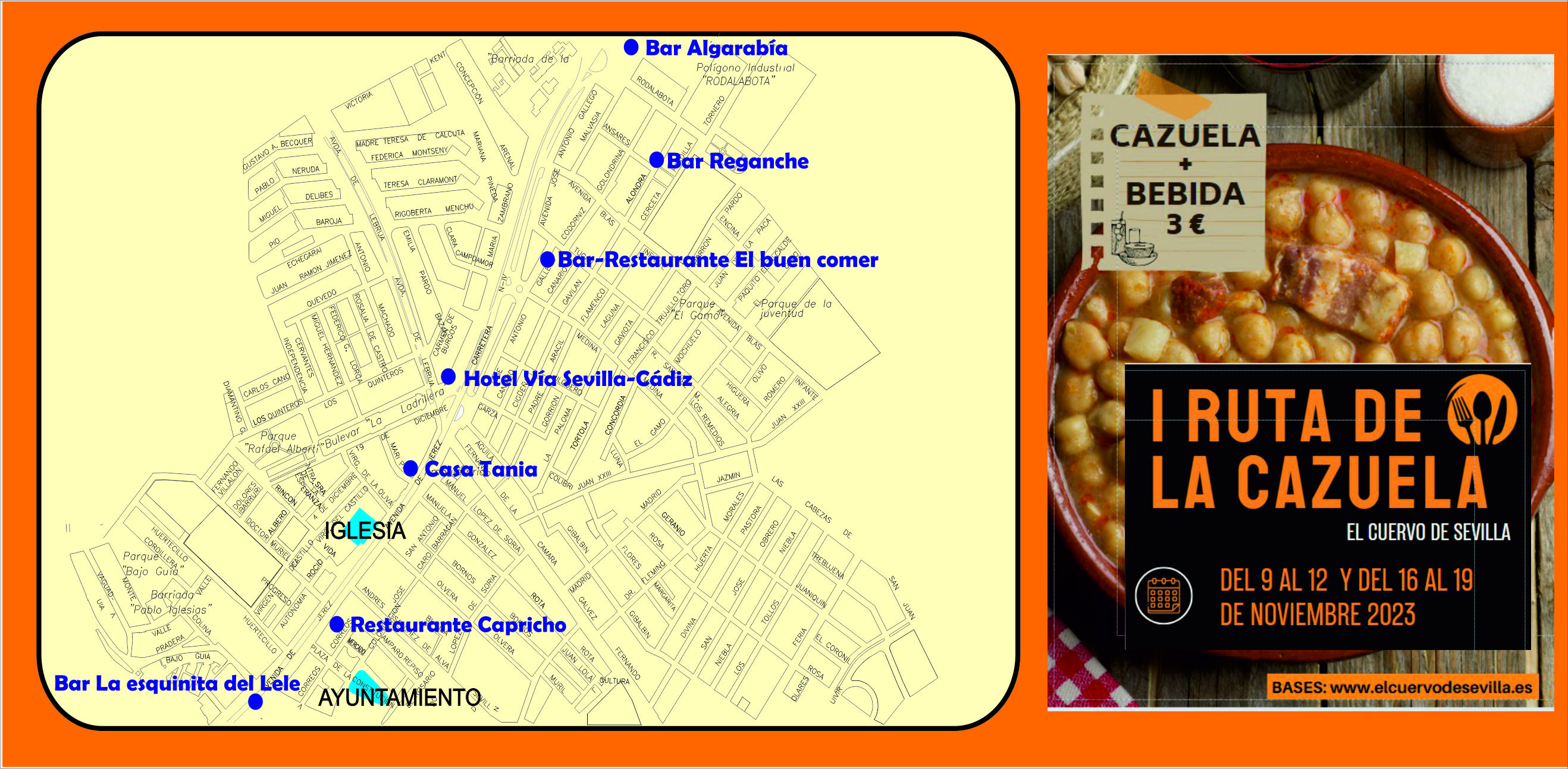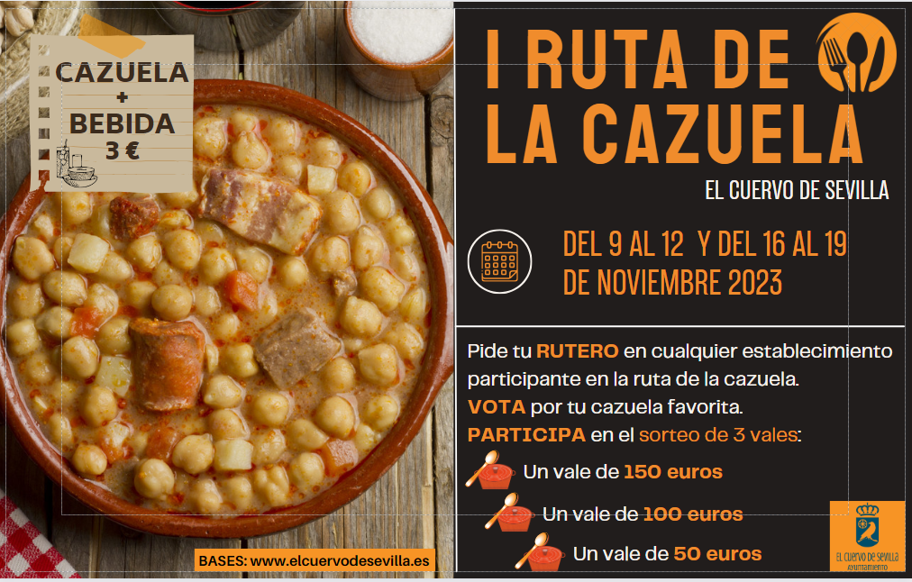 Con la realización de la I Ruta de la Cazuela, desde la Delegación de Innovación, Promoción y Empleo del Ayuntamiento de El Cuervo de Sevilla, se pretende promocionar y potenciar la actividad de restauración de los empresarios del sector de la hostelería, en nuestro municipio. Para ello se contará con la participación de todo aquel establecimiento de restauración que éste interesado y cumpla los requisitos establecidos en las siguientes bases.
