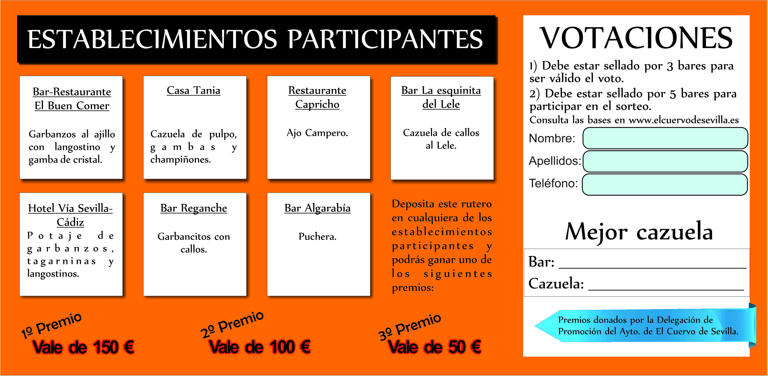 Todos los establecimientos gastronómicos de El Cuervo que hayan entregado la inscripción correspondiente en la oficina del Registro General de Entrada de Documentos del Ilustrísimo Ayuntamiento de El Cuervo de Sevilla, como fecha máxima hasta el 6 de noviembre.