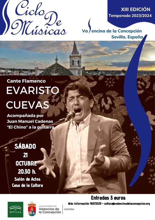 3 euros en la Secretaría de la Casa de la Cultura. Más información en el tlf 955720211 o en cultura@valencinadelaconcepcion.org Recital de cante flamencoa cargo del cantaor Evaristo Cuevas acompañado a la guitarra por Juan Manuel Cadenas, El Chino. Este recital se enmarca en el Ciclo de Músicas de Valencina en el que se traen a nuestra localidad conciertos y espectáculos musicales de diversas tradiciones, latitudes y épocas y que alcanza ya su decimotercera edición. Evaristo Cuevas nace en Osuna, en el seno de una familia cantaora. Actualmente se encuentra cursando el cuarto curso de las Enseñanzas Artísticas Superiores de Música en la Especialidad de Cante Flamenco en el Conservatorio Superior "Rafael Orozco" de Córdoba. Además de participar como formador en la Cátedra de Flamencología de dicha ciudad. Paralelamente a su formación académica, Evaristo ha recibido clases de grandes maestros como Fosforito, José Luis Postigo, David pino, Naranjito de Triana, Manuel Martín… Evaristo ha participado en numerosos festivales de gran renombre como Manelleu (Barcelona), Osuna, Carmona… compartiendo cartel con primeras figuras, además de participar en varios circuitos recorriendo peñas flamencas por toda España. Tiene en su haber numerosos premios en concursos, entre los que destacan: primer premio por Murcianas y Demás Cantes Mineros "Festival del Cante de la Unión" (Murcia) 2018, primer premio Soleá Alcalá en Alcalá de Guadaira (2016), primer premio Cantes Básicos "Festival Internacional de Lo Ferro (Murcia) 2017, primer premio por Seguiriyas "Festival Internacional Cante de las Minas" La Unión (Murcia) 2016, entre otros muchos.