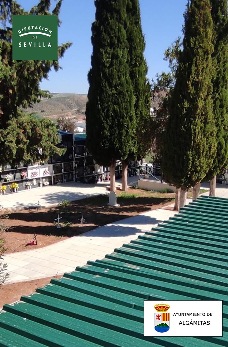 Gracias a la subvención concedida por el Área de Concertación de la Excma. Diputación de Sevilla, CONVOCATORIA DE SUBVENCIONES A CONCEDER EN RÉGIMEN DE CONCURRENCIA NO COMPETITIVA POR EL ÁREA DE CONCERTACIÓN DIRIGIDA A ENTES LOCALES PARA LA REALIZACIÓN DE ACTIVIDADES DENTRO DE SU ÁMBITO COMPETENCIAL 2022, se ha podido proceder a la limpieza de la parte superior de los nichos del Cementerio Municipal y posteriormente colocarle una subestructura metálica atornillada a la cubierta de los nichos con protección mediante colocación de cubierta de chapa trapezoidal color verde.