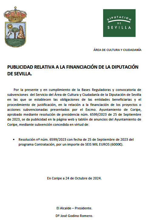 Por la presente y en cumplimiento de la Bases Reguladoras y convocatoria de subvenciones del Servicio del Área de Cultura y Ciudadanía de la Diputación de Sevilla en las que se establecen las obligaciones de las entidades beneficiarias y el procedimiento de justificación, en la relación a la financiación de los proyectos o acciones subvencionadas presentados por el Excmo. Ayuntamiento de Coripe, aprobado mediante resolución de presidencia núm. 6599/2023 de 25 de Septiembre de 2023, se da publicidad en la página web y tablón de anuncios del Ayuntamiento de Coripe, mediante subvención concedida en virtud de: