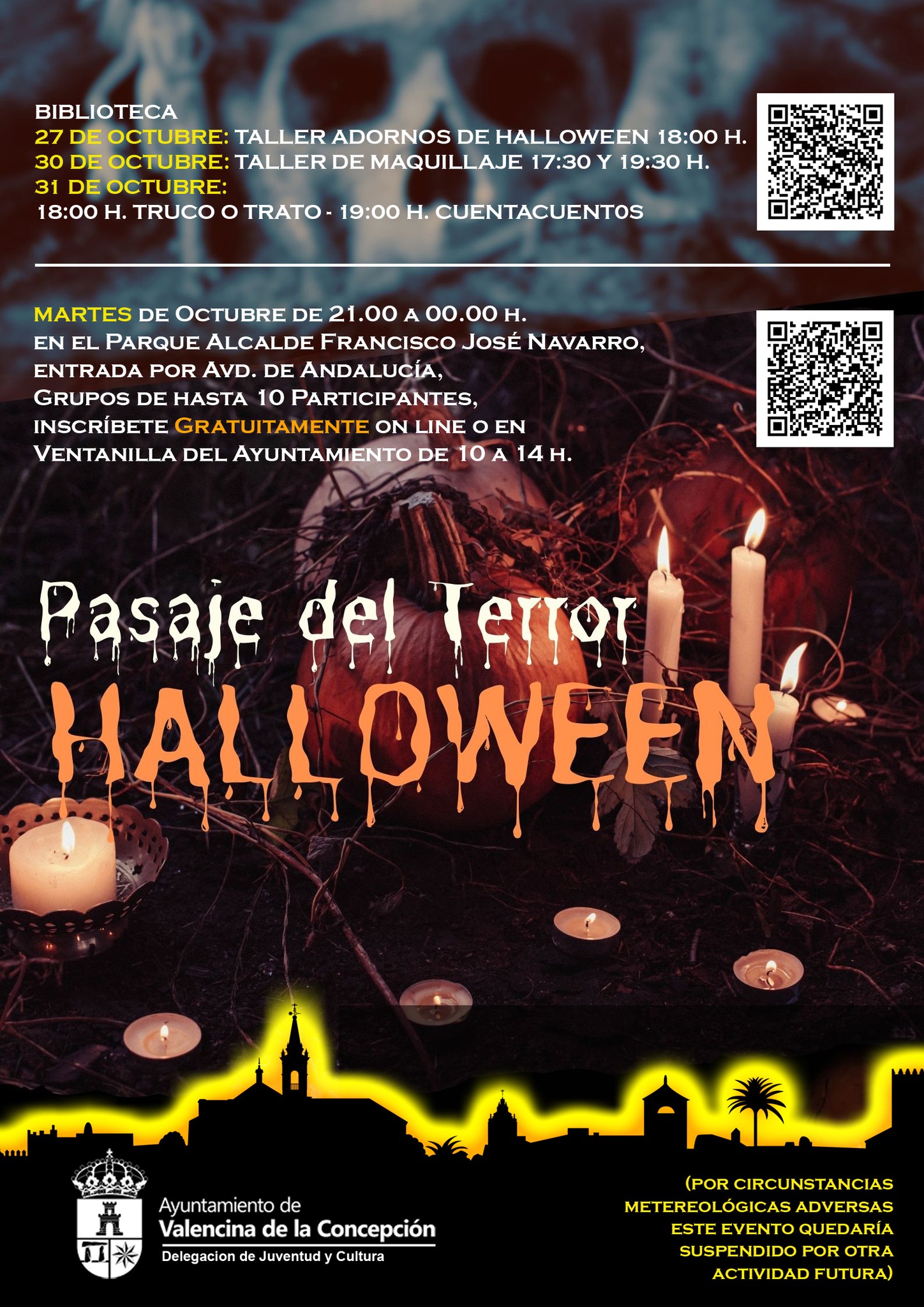 De 18:00 a 19: 00 h, Pasacalles "Truco o Trato"De 19:00 a 20:00h, Cuentacuentos en la Plaza España. De 21:00 a 00:00, Circuito del Terror en el Bosque Viviente. Parque alcalde Francisco José Navarro Gómez. Entrada por la Avda. de Andalucía. Los grupos serán como máximo de 10 pax. Actividad Gratuita que requiere inscripción a través de ventanilla en el ayuntamiento de 10:00 a 14:00 o de manera online :