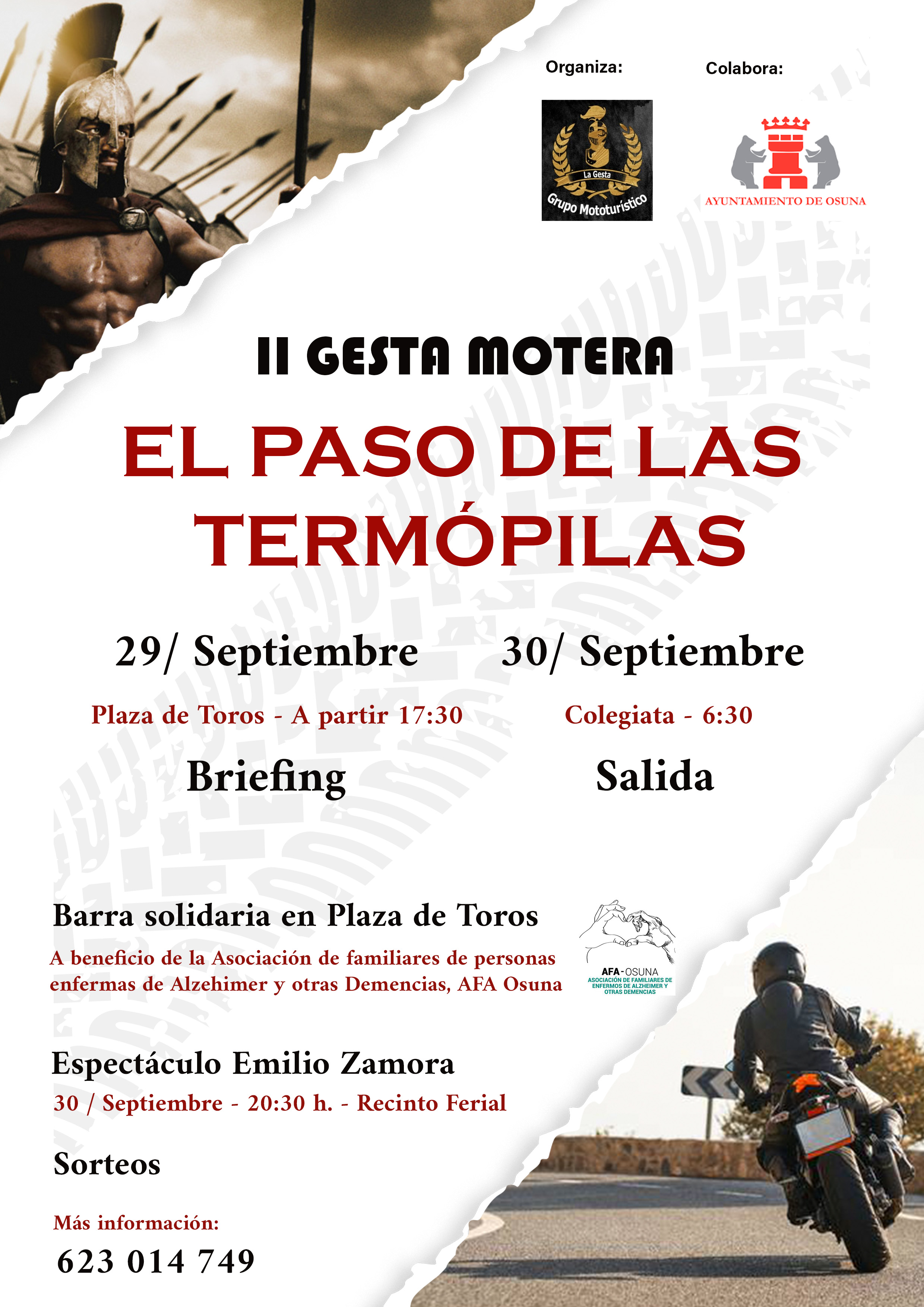 El próximo fin semana Osuna disfrutará con la celebración de la ruta motera denominada "El Paso de las Termópilas", la segunda gesta motera organizada por Benjamín Cadenas, un gran aficionado a las motos y a este tipo de rutas, en colaboración con el Ayuntamiento de Osuna.